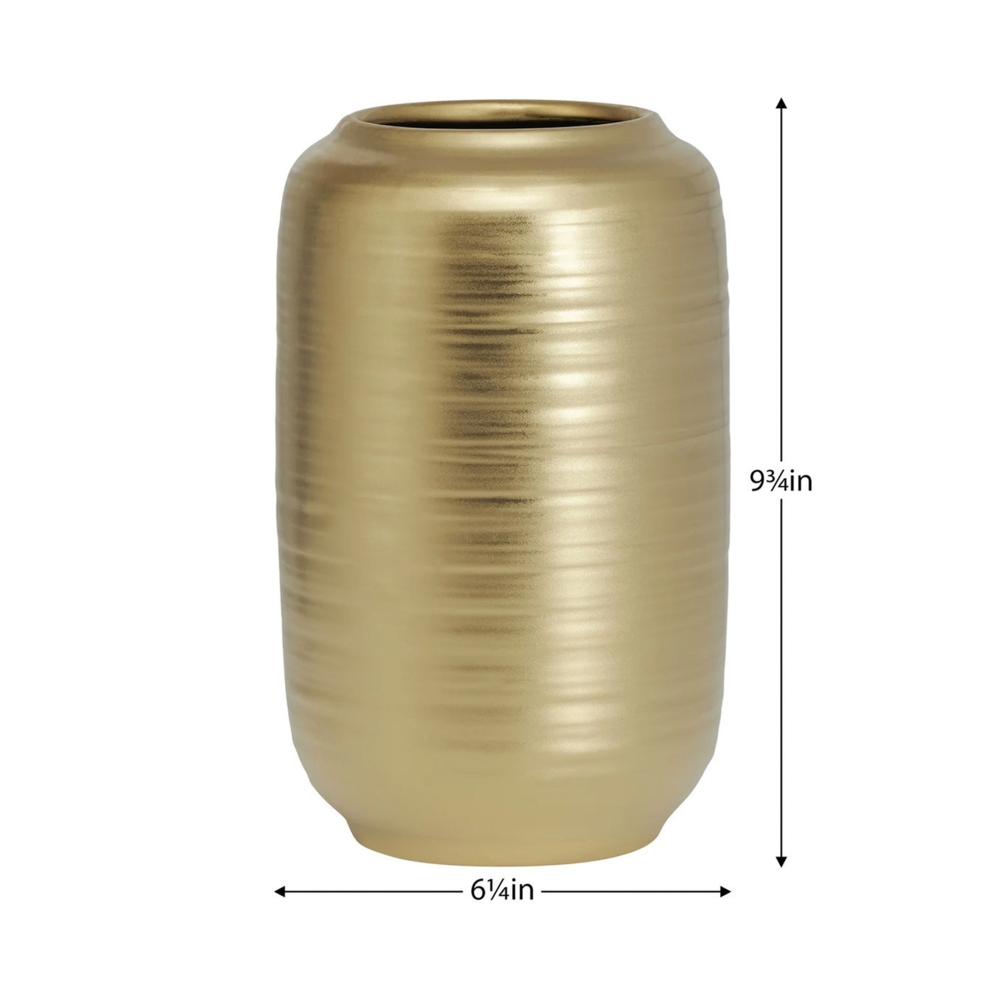 Add a touch of elegance and timeless beauty to your living room or dining room with the Adina matte gold finish ceramic vase. Its sleek and sophisticated design makes it a perfect centerpiece for special events or everyday decor. Whether used as a bouquet vase or displayed on a console table, this vase effortlessly combines modern style with a touch of refined charm, elevating the ambiance of any space.