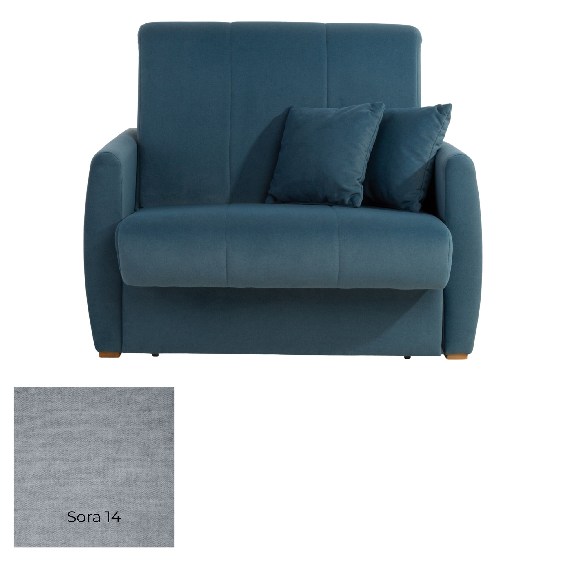 Looking for a sleeper sofa for a very small space? The compact DALIA chair is only 116 cm wide and easily transforms into a bed when needed. It unfolds forward, so just leave a bit of space in front. A hidden storage compartment under the seat keeps bedding close at hand. The sturdy frame is made from wood, plywood, and fiberboard, with wave springs and HR foam ensuring a comfortable rest. Once unfolded, the sleeping area measures 90 x 192 cm.