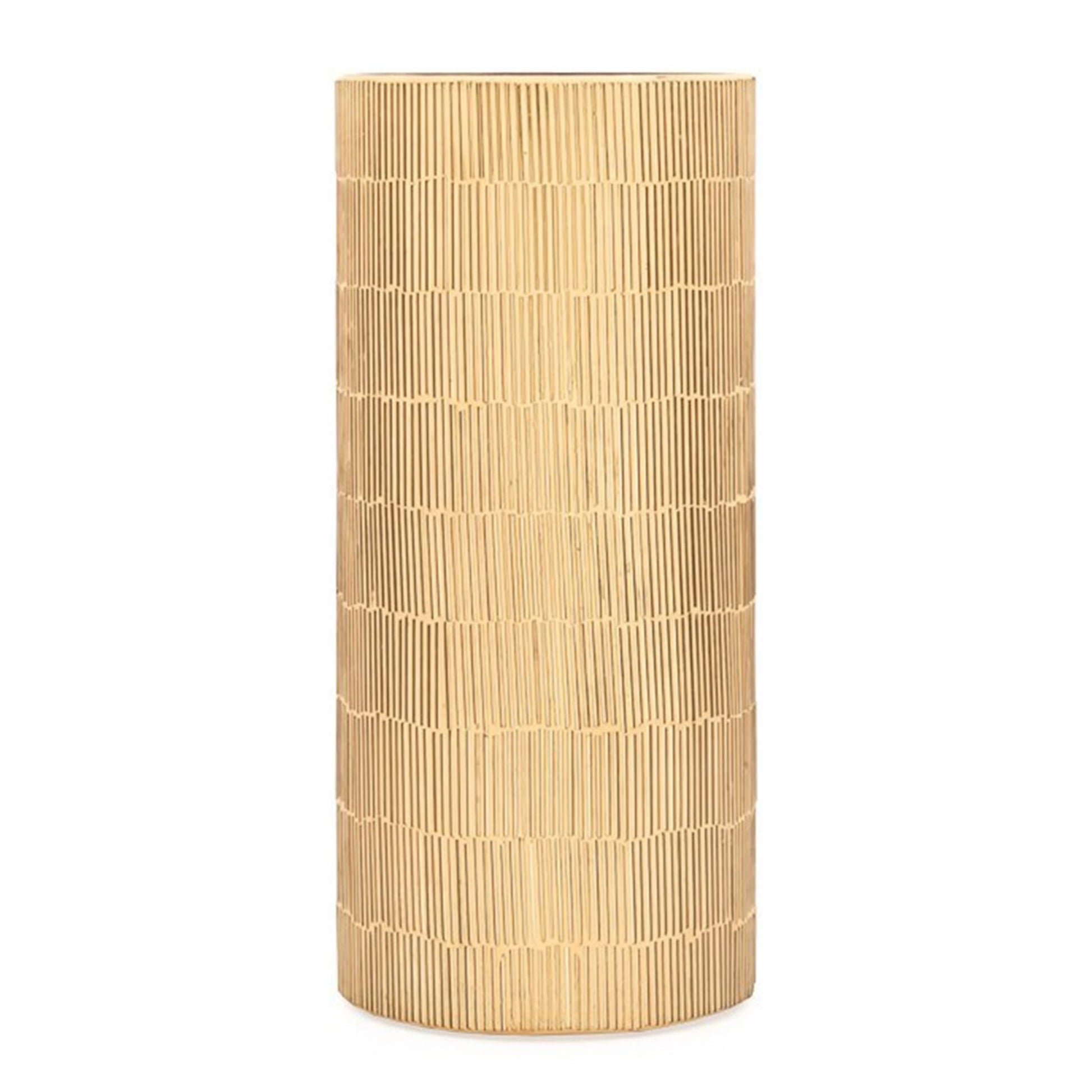Shimmering glass surrounds a glass vase in a bamboo mosaic pattern. It can also be used as a hurricane candleholder!