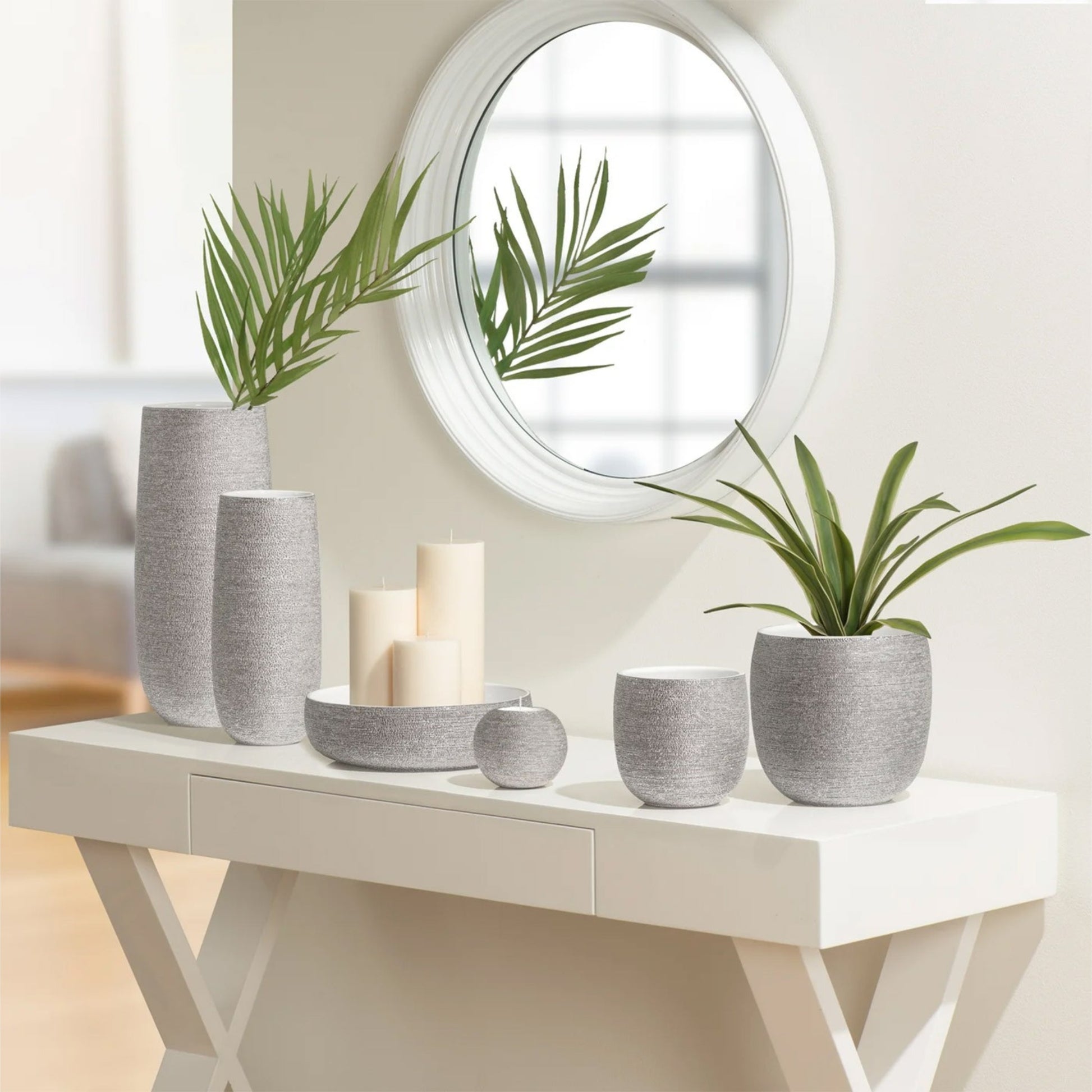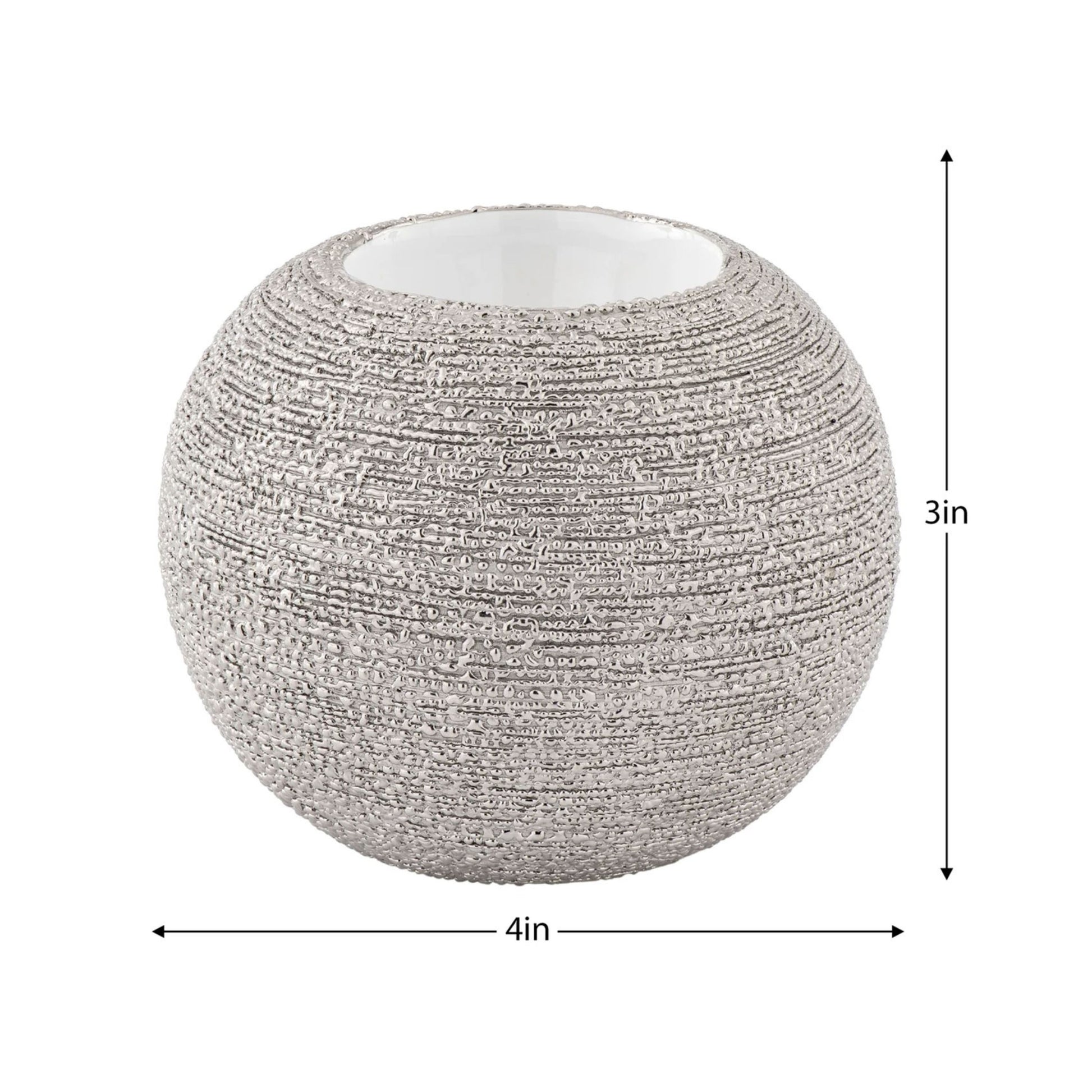 This modern textured metallic ceramic tea light holder is perfectly balanced by a smooth white glaze inside, making it a wonderful decorative addition to any home or office. The contemporary yet classic design blends seamlessly with any living room or bedroom decor. It can be paired with other decorative objects on a shelf or table to add a touch of drama and beauty. Combine multiple pieces to create a standout centrepiece on the dining table or at your next event. The silver sparkle of this beautiful candle holder makes it a perfect accent piece for weddings or as a holiday accent piece.