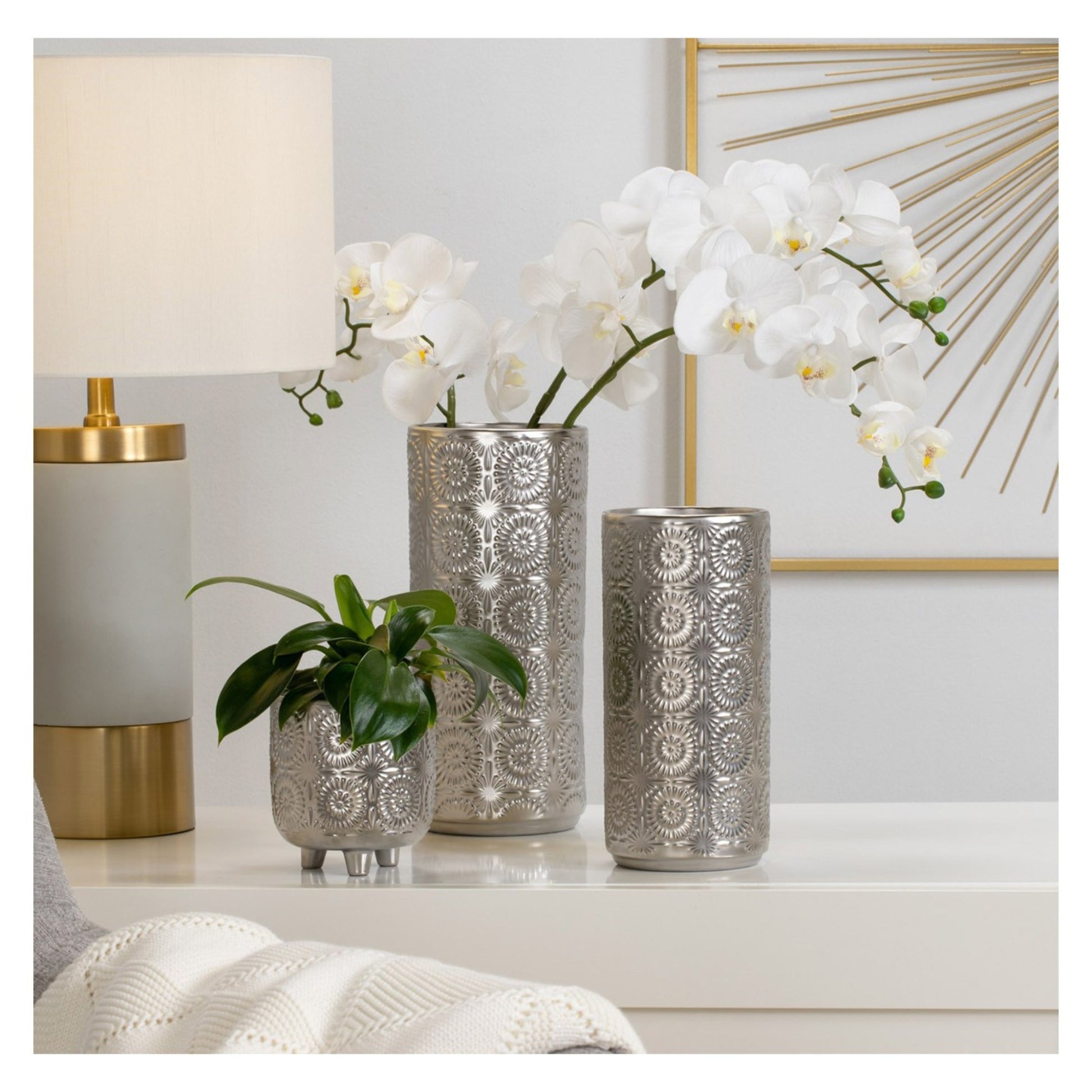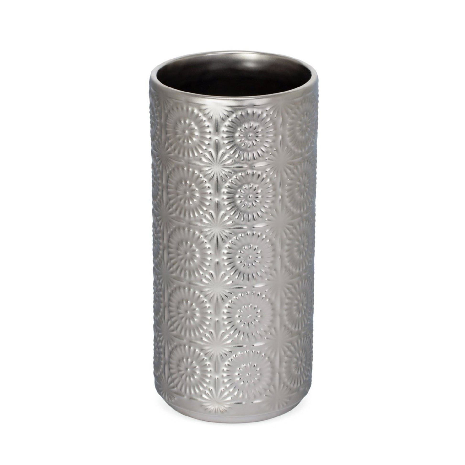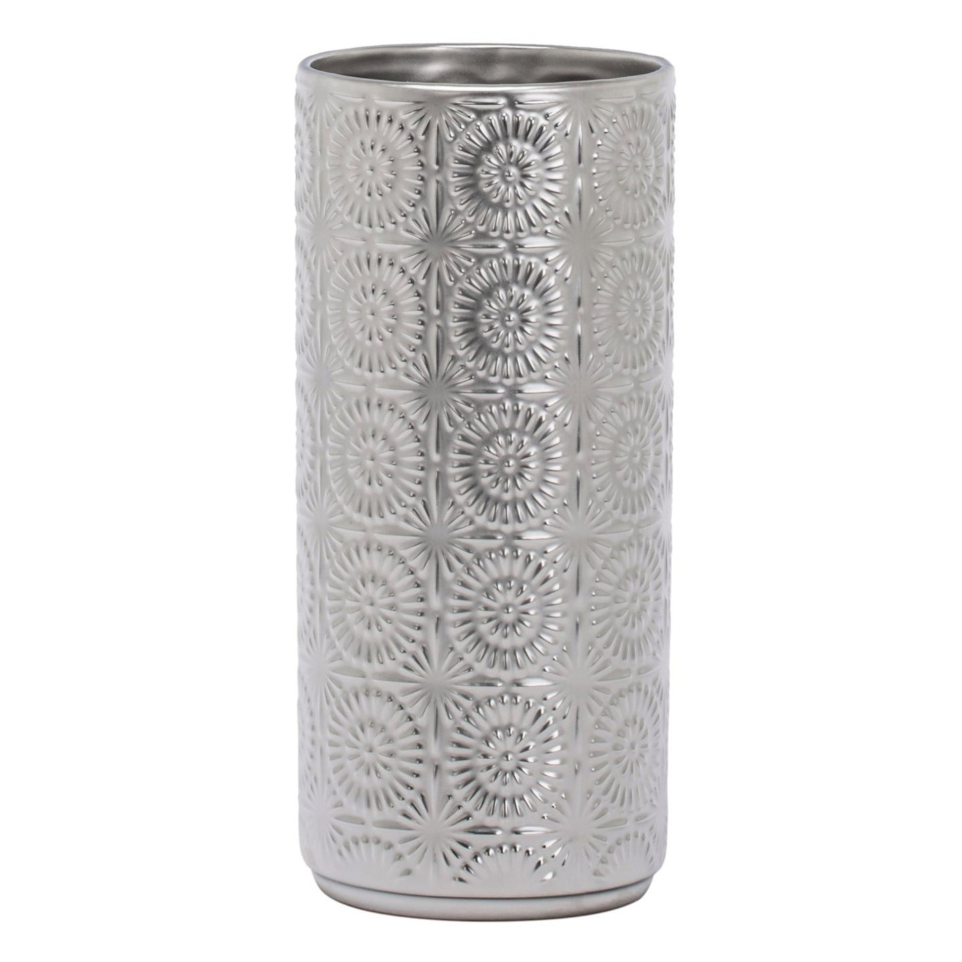 The Clara Mandala ceramic vase in matte silver is a balanced burst of geometric shapes and patterns. Place this cylinder vase on a shelf or table and fill with dramatic fresh or faux florals, twigs, or use on its own for a modern look. Pair with other items from the Clara series to create your own unique display. Perfect for the home or office.