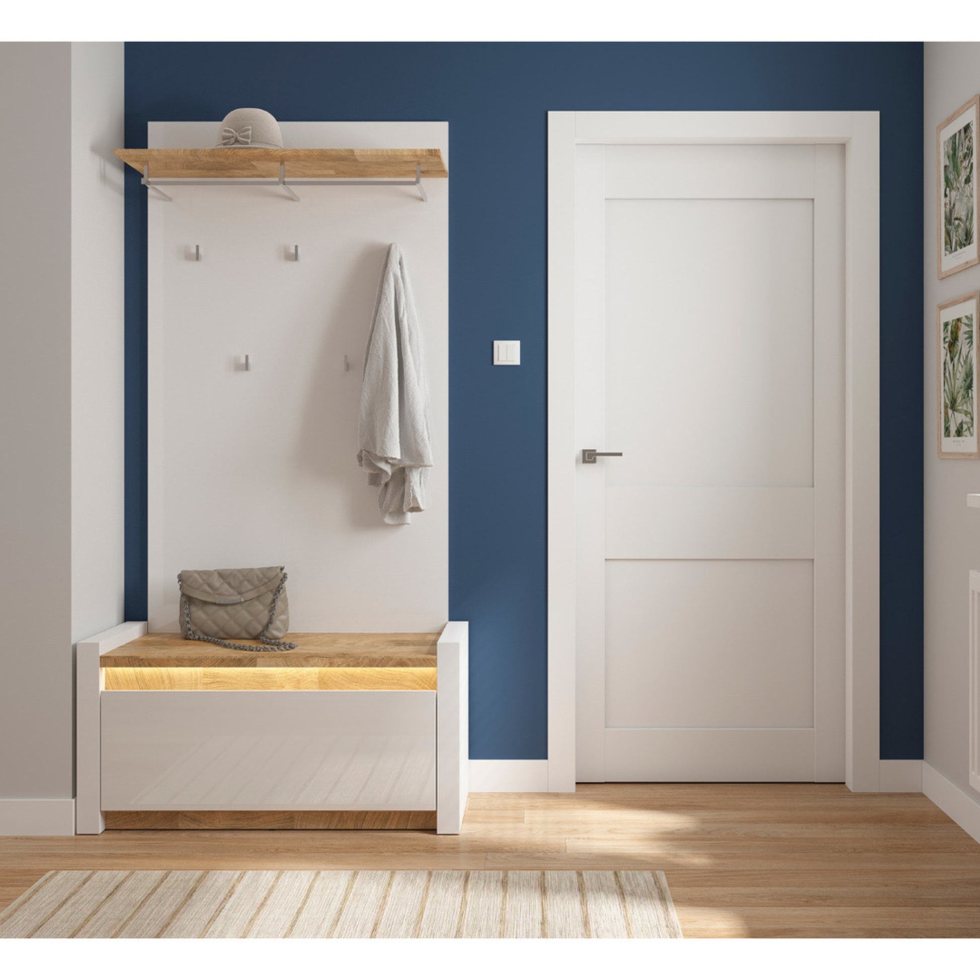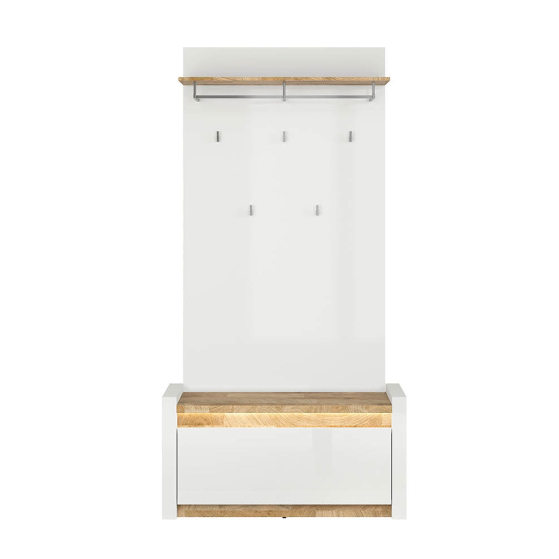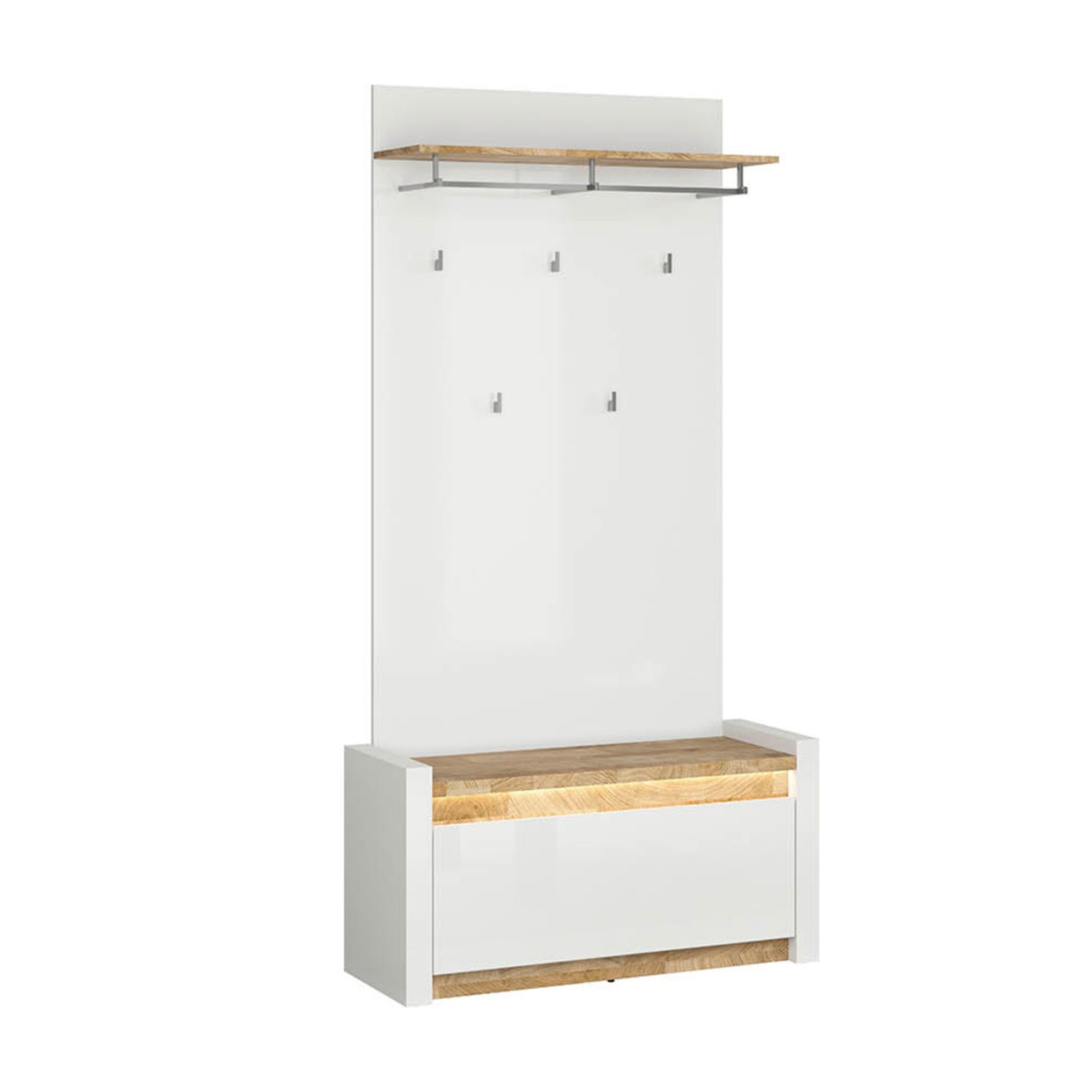 There is a piece of furniture without which it is difficult to imagine a hallway. It is a roomy and helpful coat rack. It is equipped with five practical hooks and a hanging bar. Additionally, it features an upper shelf for hats, scarves or gloves.