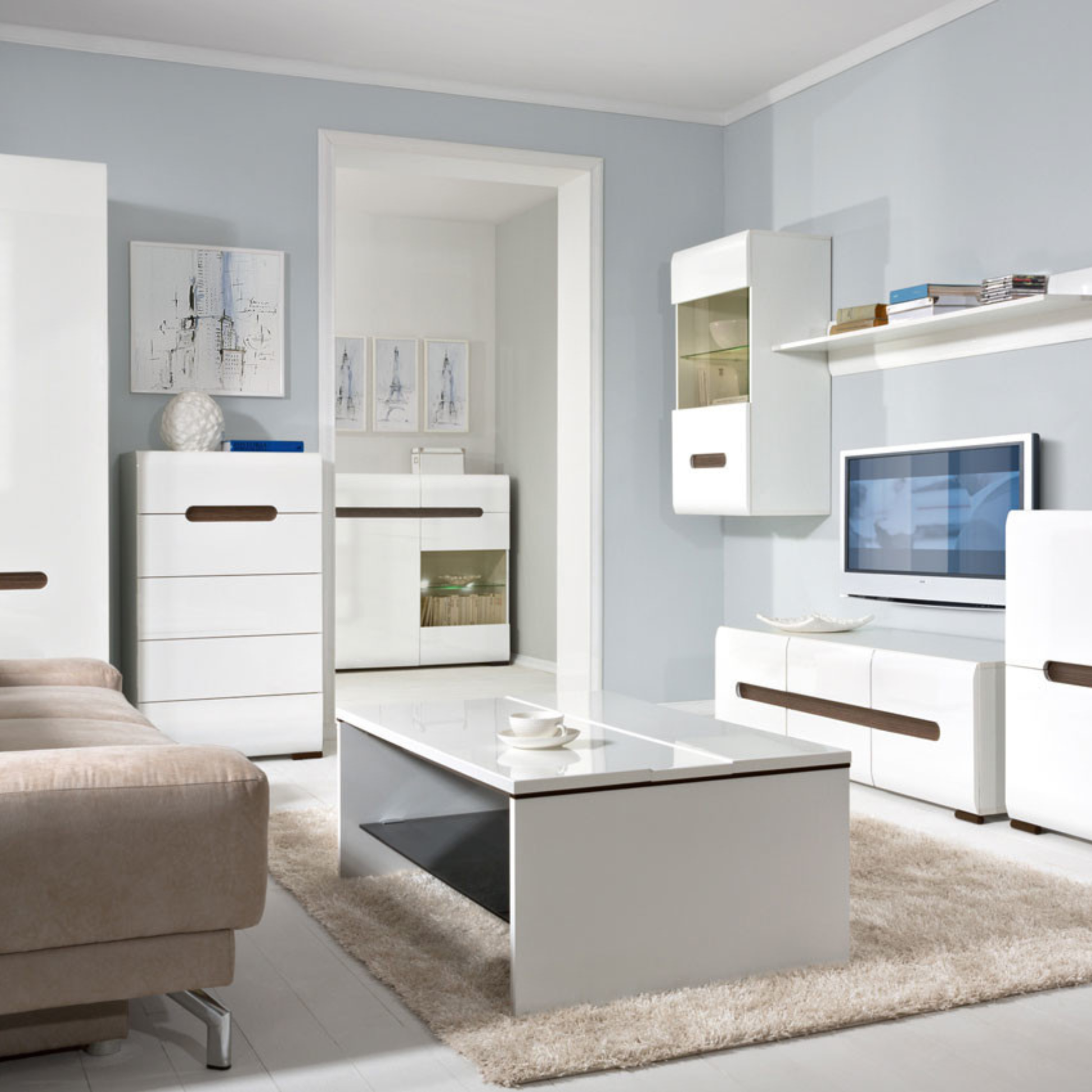 Azteca Trio may be your choice if you seek simple elegance yet stand-out pieces for your living space. This collection follows the latest trends. Its white colour will brighten any room and stay stylish throughout time. High gloss white fronts reflect its modern look. The soft closing system will make Azteca Trio pieces a pure pleasure for everyday use.