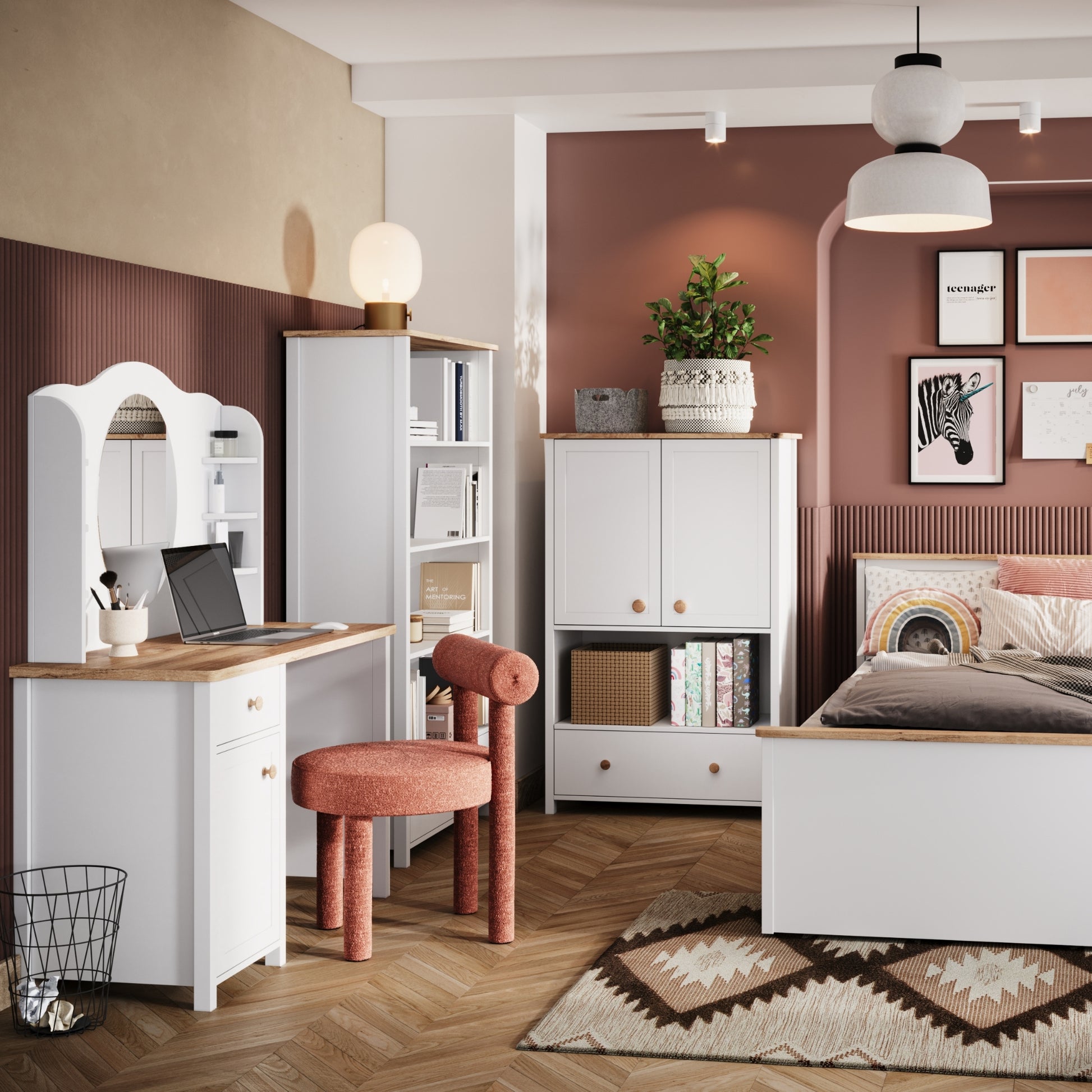 The Story collection draws inspiration from the Provence interior design style, which is always in demand for its natural and simple aesthetic with soothing colour tones. This Mediterranean style can add a touch of charm to any youth room, whether in a modern condo or a townhouse. The collection's primary colours, white and oak Nash, create a harmonious and cozy atmosphere. The Story modular series offers many pieces to help turn your child's dream room into reality.