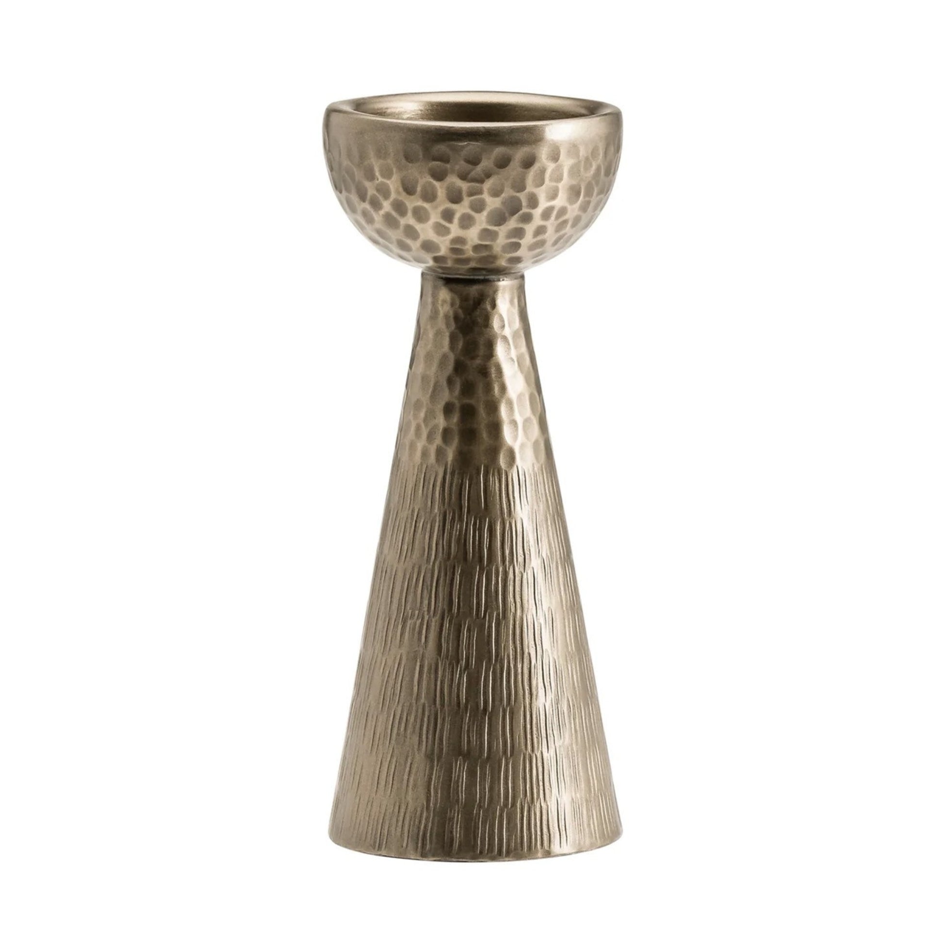 Make a statement with this handcrafted aluminum candle holder. The unique pattern showcases two different hammer techniques and has an antique finish, making it a stunning decorative accent for any home.