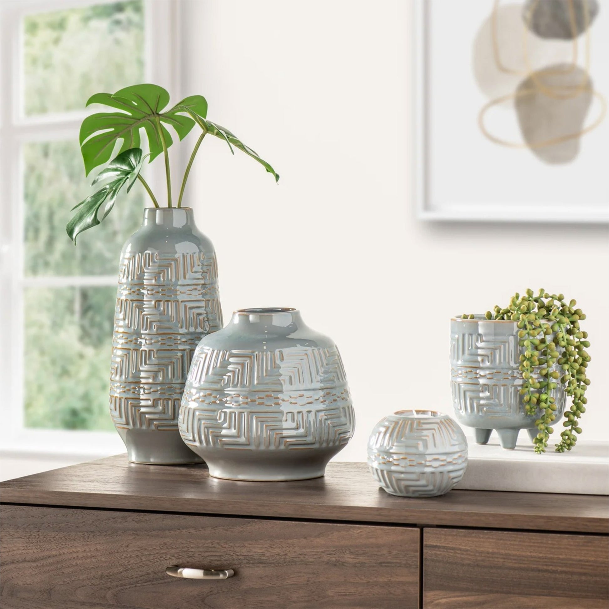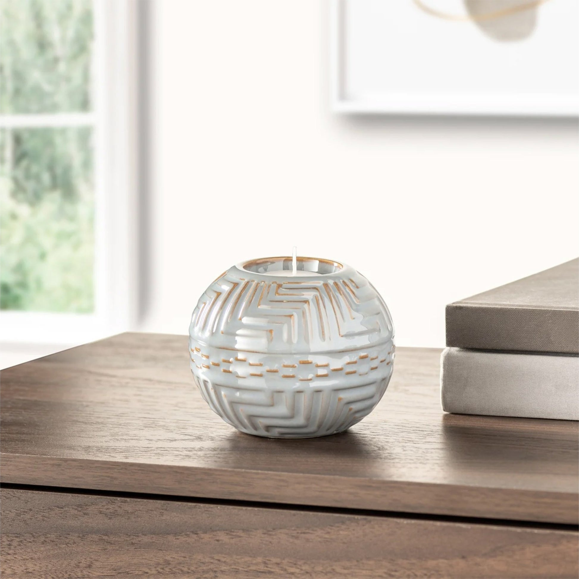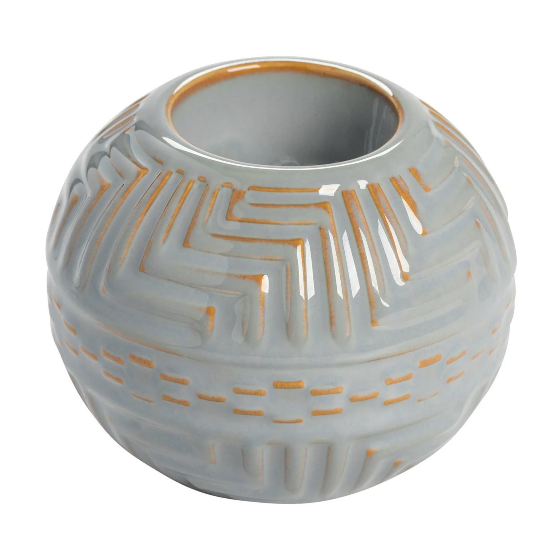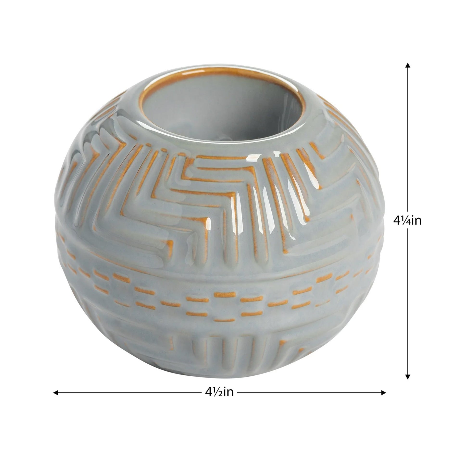 Elevate any room in your home with this modern ceramic tealight holder. The embossed maze pattern is beautifully showcased by a blue-brown reactive glaze finish, while the round ball shape adds style and interest to this gorgeous piece.