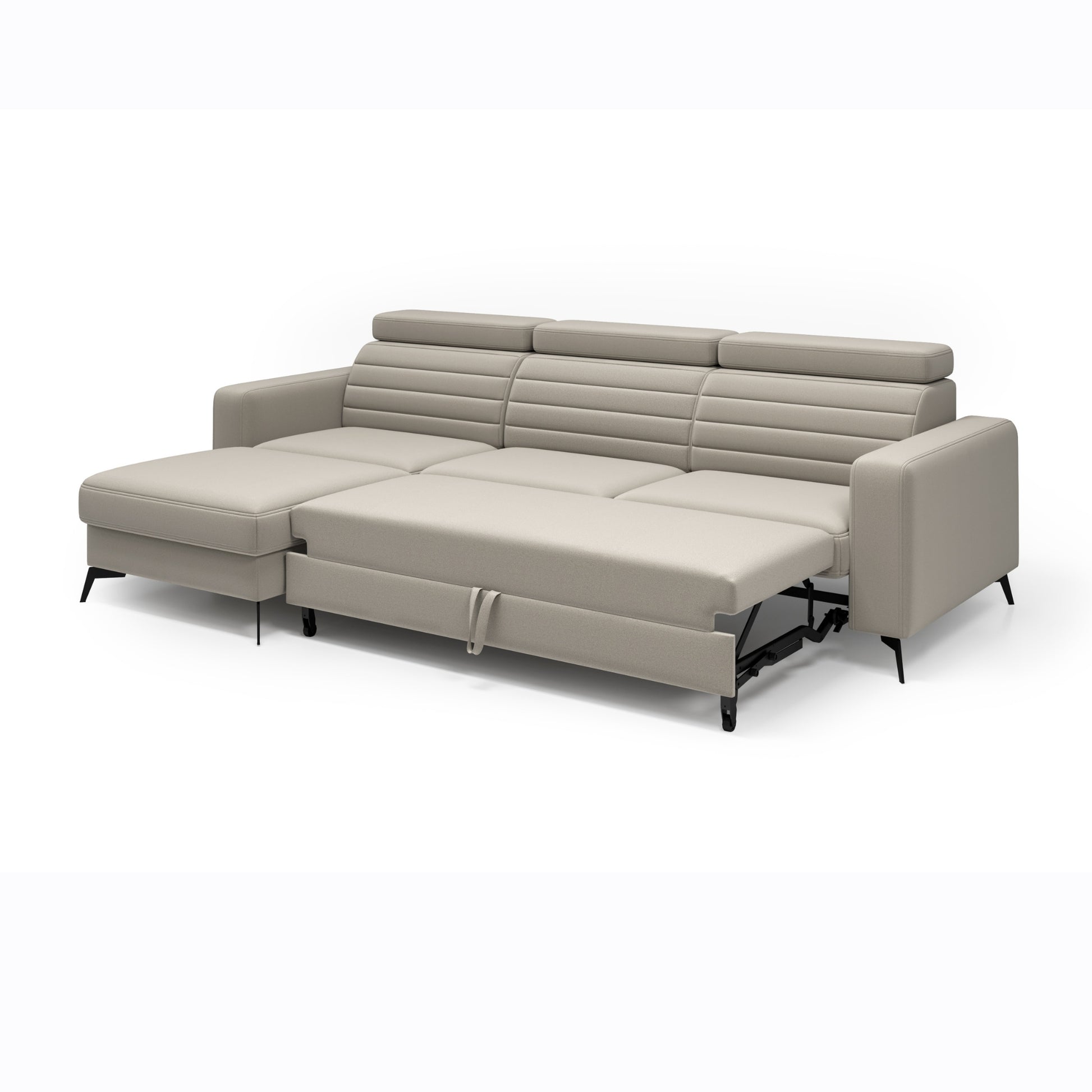 In addition to its elegant design, the Amaro sectional features a convenient sleeping function that can be easily unfolded with a 'dolphin-type automatic mechanism. It also includes a spacious storage compartment, providing a practical and versatile addition to your living space.