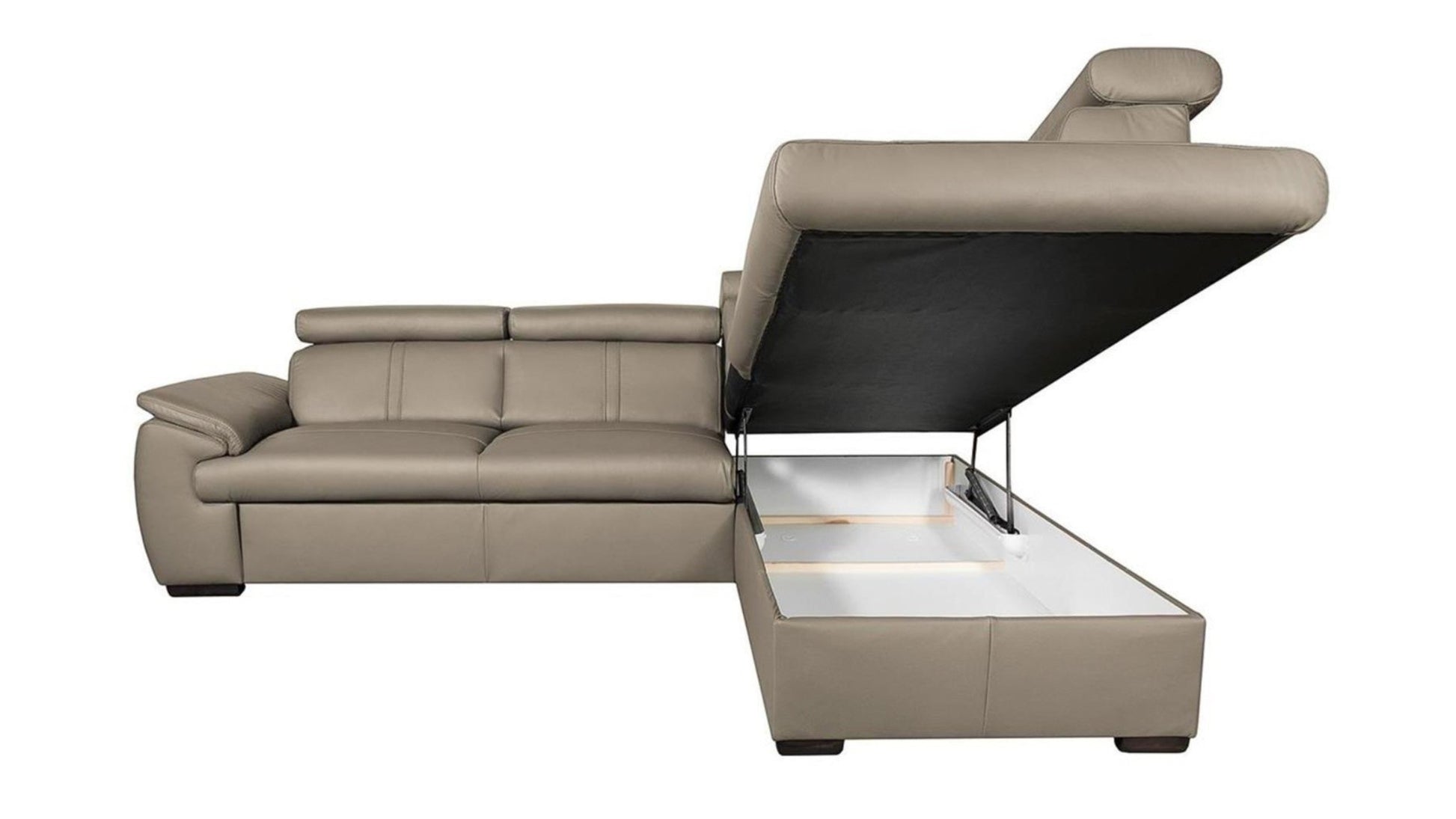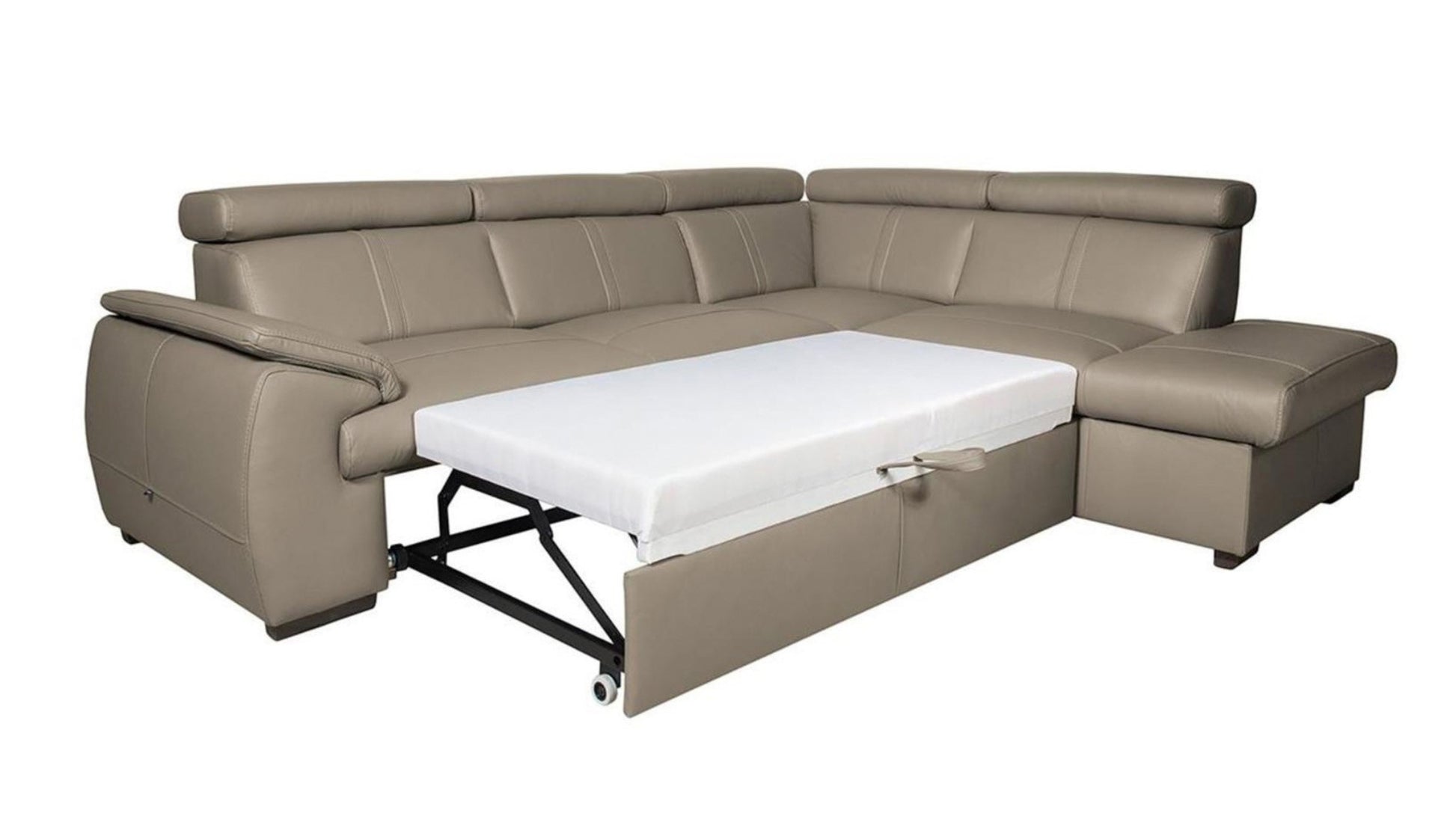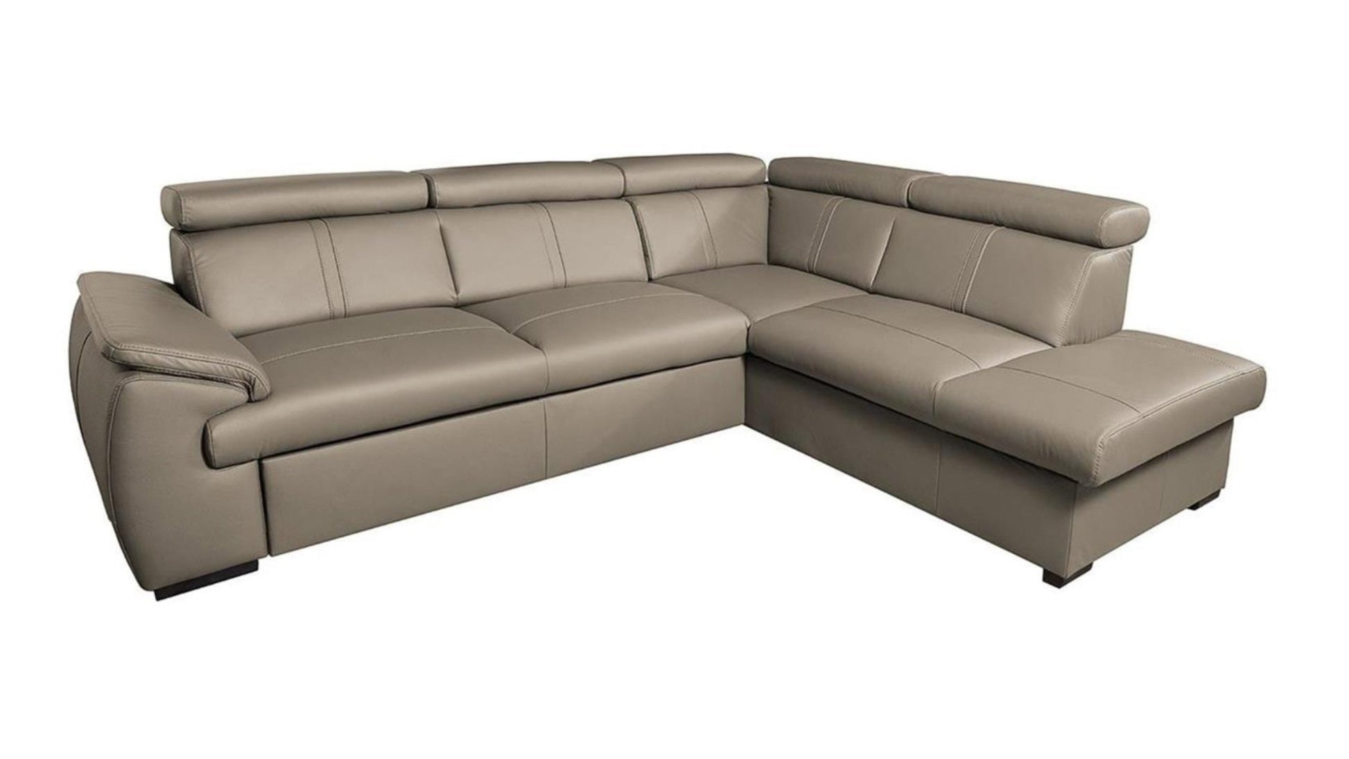 This corner sofa is a natural oasis of well-being. Thanks to the high-quality leather upholstery and generous dimensions, City is ideal for relaxing. This sectional dazzles with its attractive appearance, determined by the distinctive silhouette, decorative topstitching on the seat and back and a wide padded armrest. Additionally, five adjustable headrests will help support your back how you want by ensuring the angle you crave. You will be thrilled to find that City is beautiful and versatile; this model features a fold-out bed and storage for linens and throws.