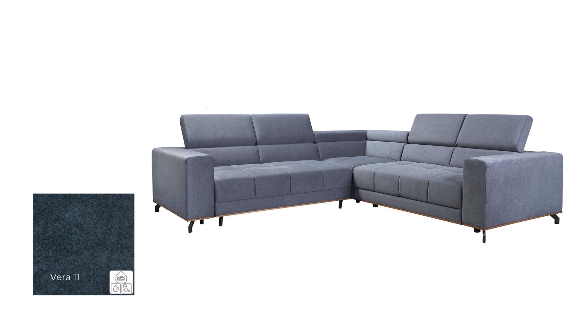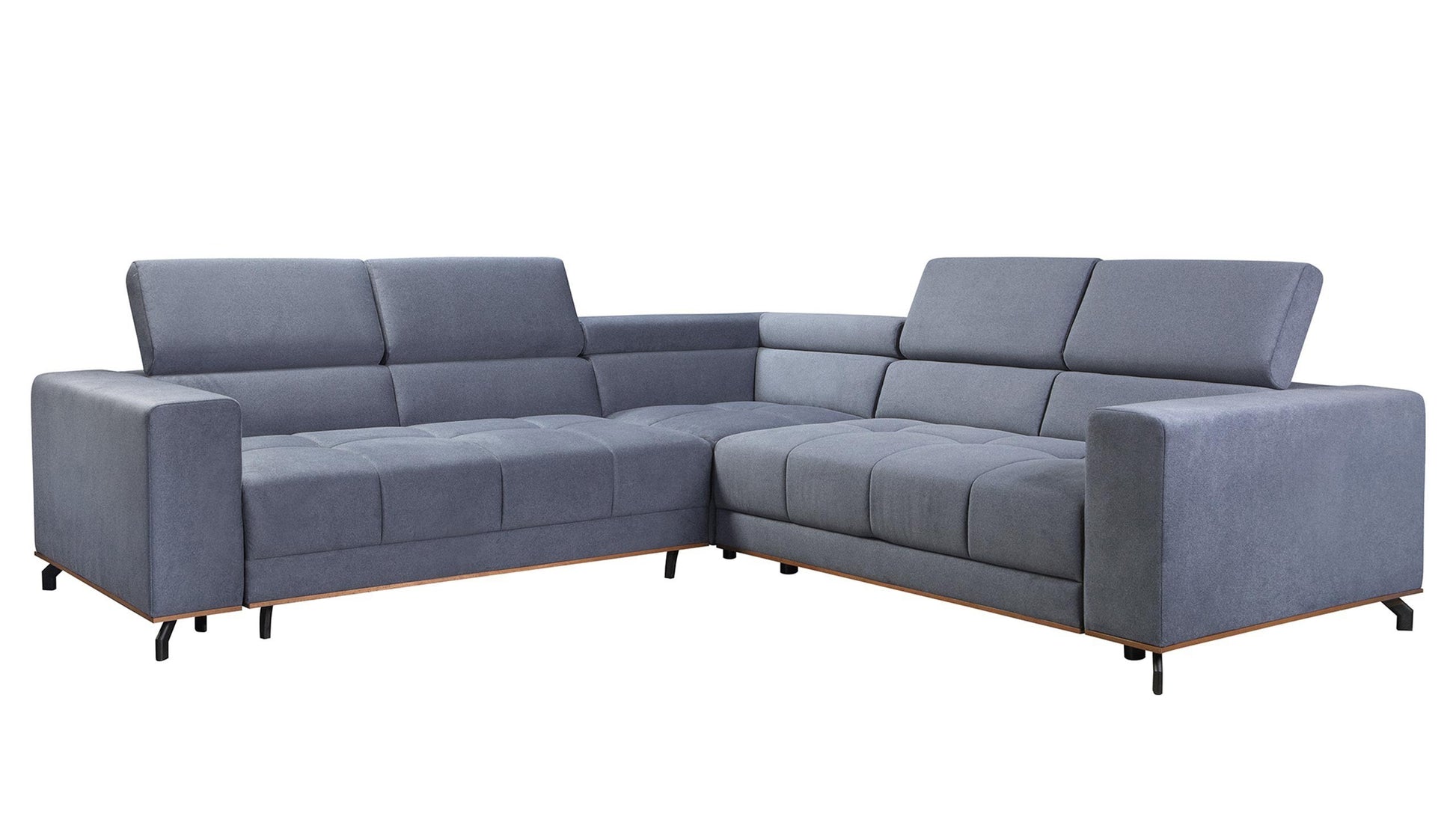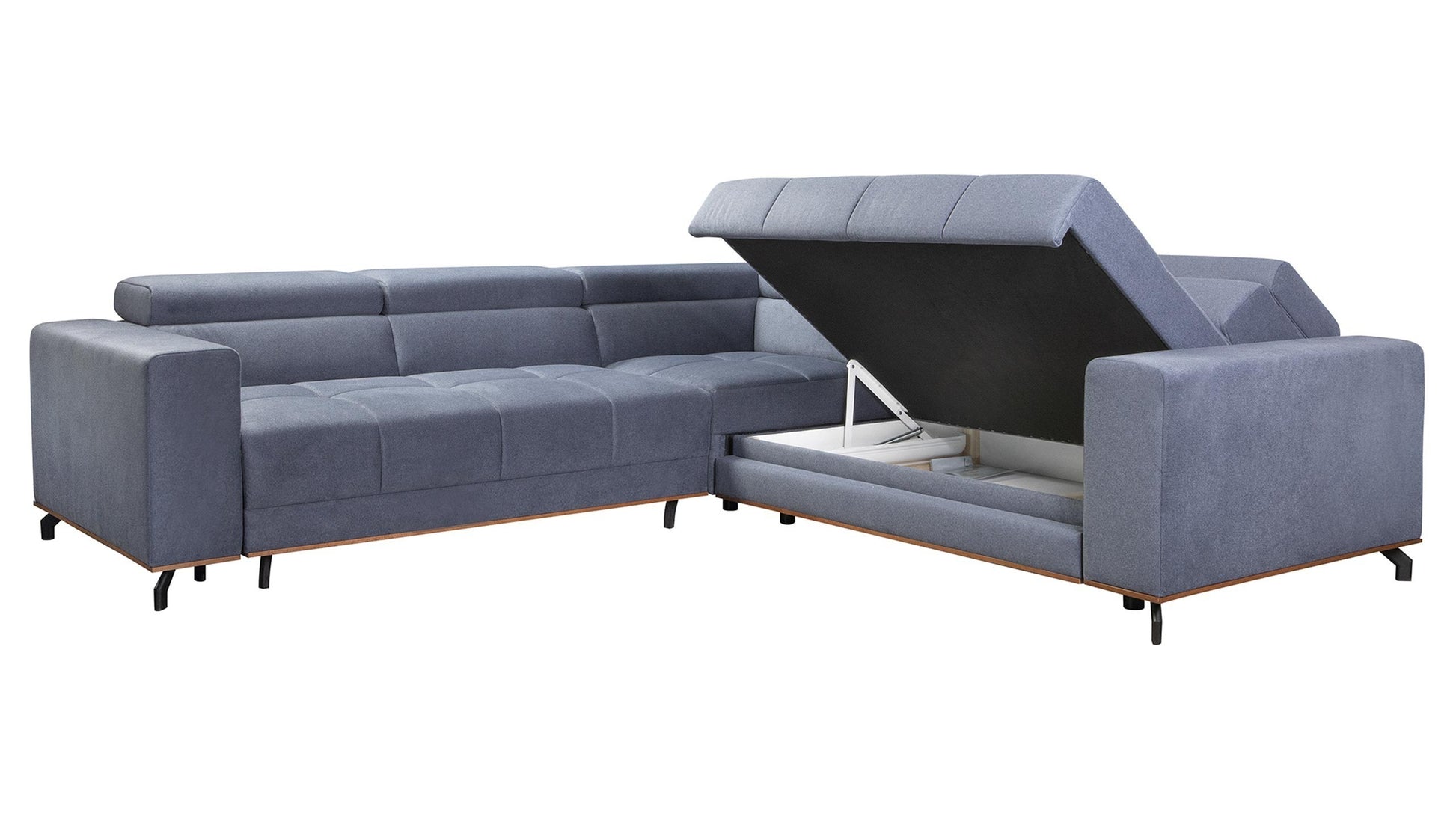 Party is a piece you will adore, and it will make a stirring impression on your guests. The grid tufted seat is nestled between wide track arms, the wood trim under the sofa emphasizes Party's sophisticated silhouette, and it can be stained in a few available colours to match your interior. Sectional perches on slim black matte legs that go outwards. This adds some loft and an airy look to the whole massive piece. The very low back looks industrial and modern, but if you want to sit upright with good back support, lift the headrest and gain an extra 21 cm high on the back (full height range 74-95cm). This inviting sectional ensures an incredibly comfortable lounging experience, and if you need an extra bed for your guests - the Party opens up for a roomy double-size sleeper easily. Bedding and blankets will be placed in ample storage under the seat.