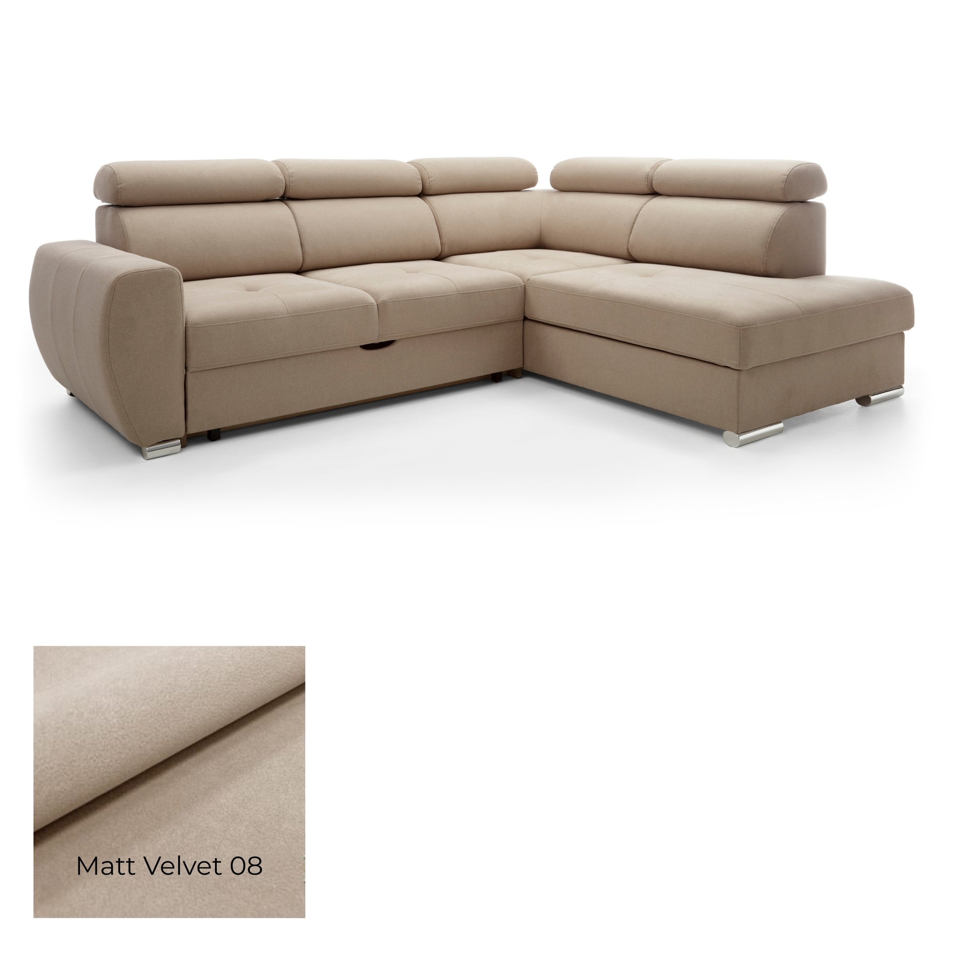 The Patrizia corner sofa combines comfort and functionality and is incorporated into elegant, rounded shapes. Its ergonomic design, including a profiled backrest and movable headrests, ensures a high level of comfort. The Patrizia model also stands out for its versatility, offering a sleeping function that opens with a modern 'puma' automatic mechanism. This allows the furniture to be unfolded in one smooth movement. An additional advantage is the container located in the ottoman, which makes Patrizia not only a place to relax but also a practical storage solution.