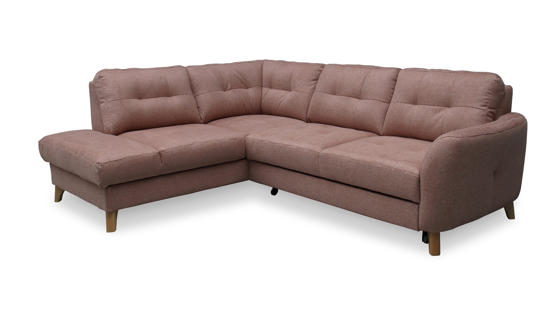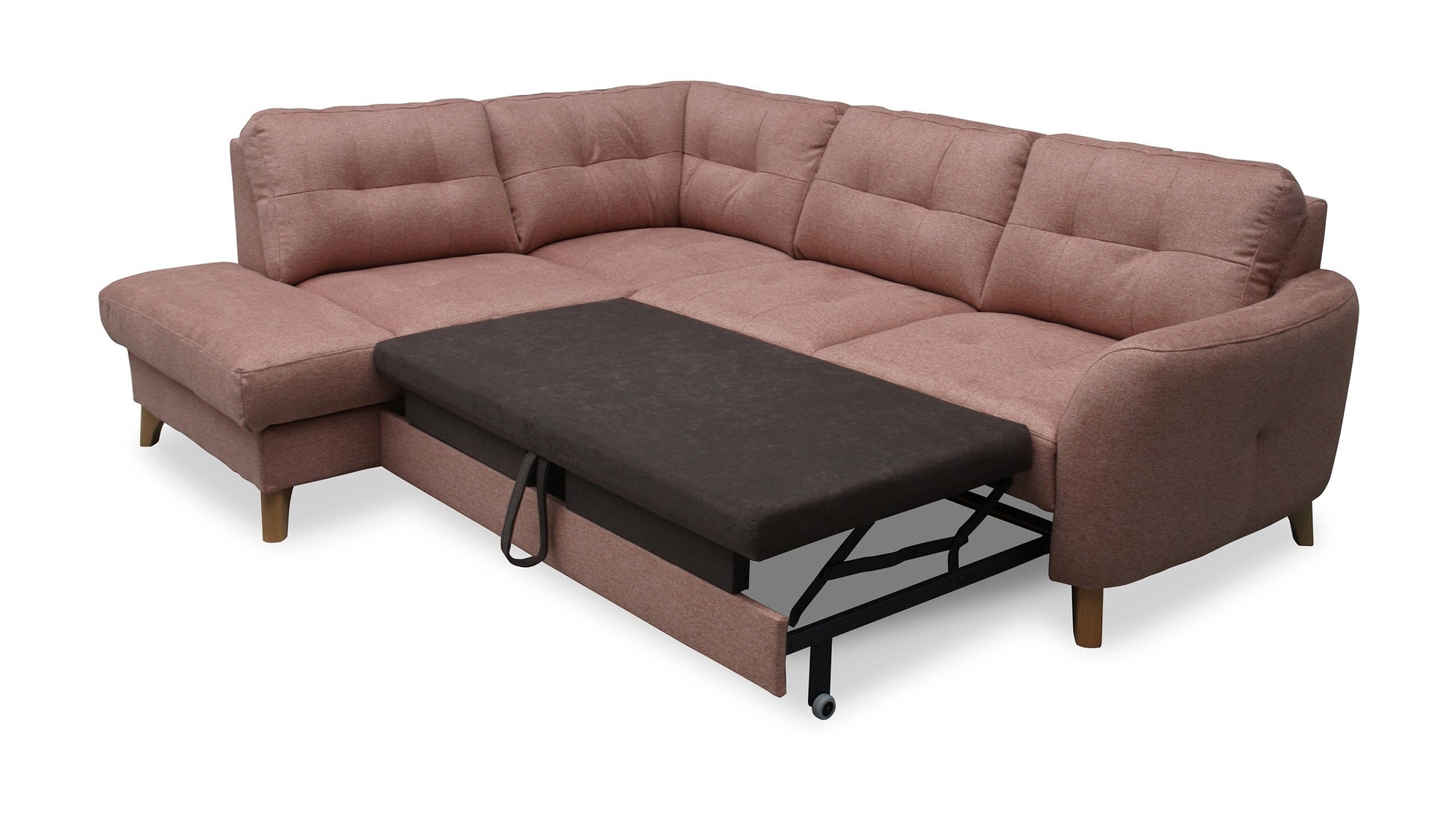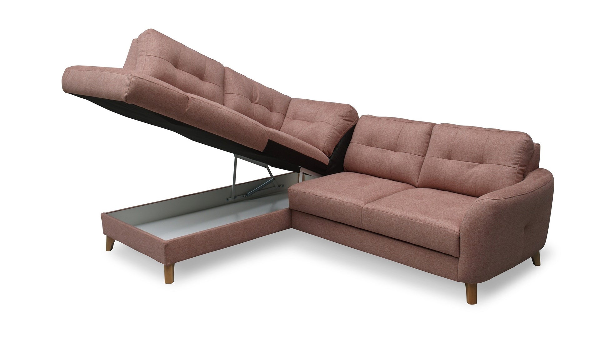 This compact sectional sofa will fill the space in your living or family room, adding character and lightness. Delightful tufting gracing the seat and backrest makes this piece suited for contemporary, traditional and Scandinavian interiors. Gently arched and coquettish armrest break the typical sectional shape. Vista features a pull-out bed that makes you always ready for impromptu sleepovers, while a spacious storage compartment will hold spare bedding and blankets.