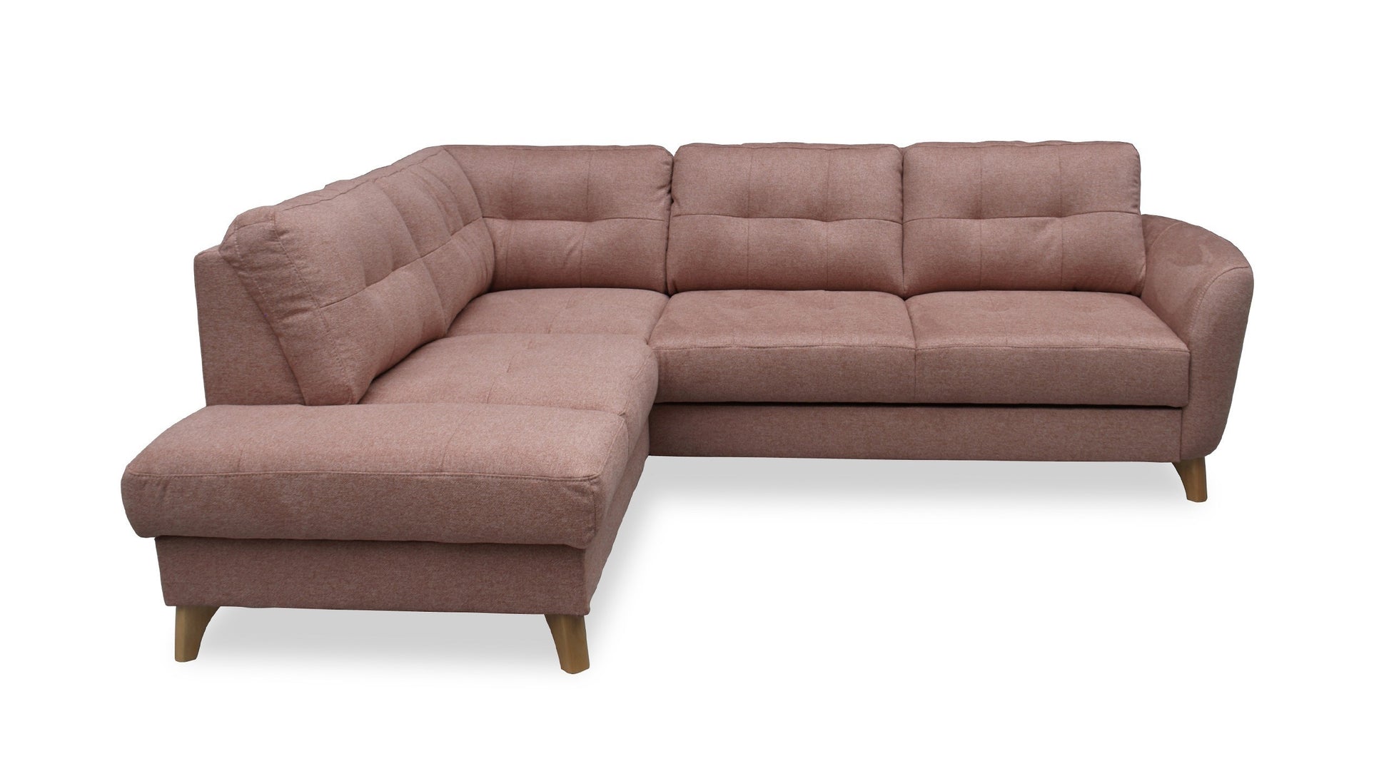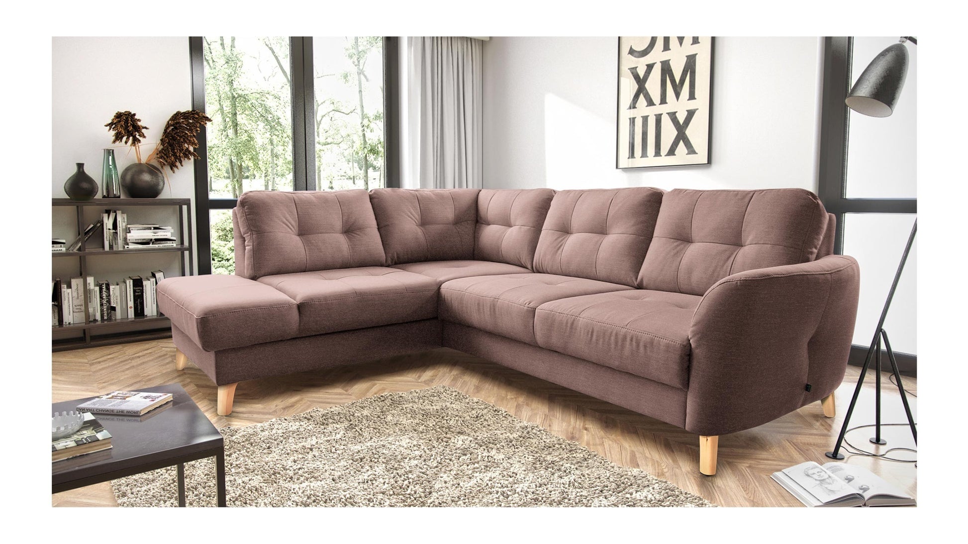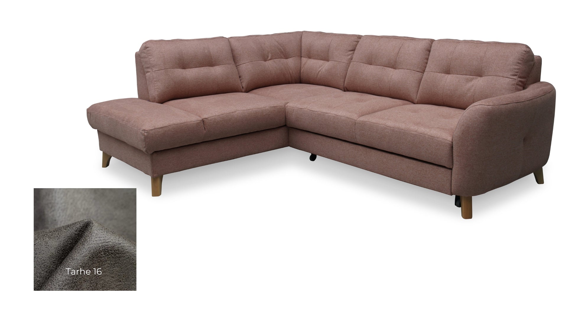 This compact sectional sofa will fill the space in your living or family room, adding character and lightness. Delightful tufting gracing the seat and backrest makes this piece suited for contemporary, traditional and Scandinavian interiors. Gently arched and coquettish armrest break the typical sectional shape. Vista features a pull-out bed that makes you always ready for impromptu sleepovers, while a spacious storage compartment will hold spare bedding and blankets.