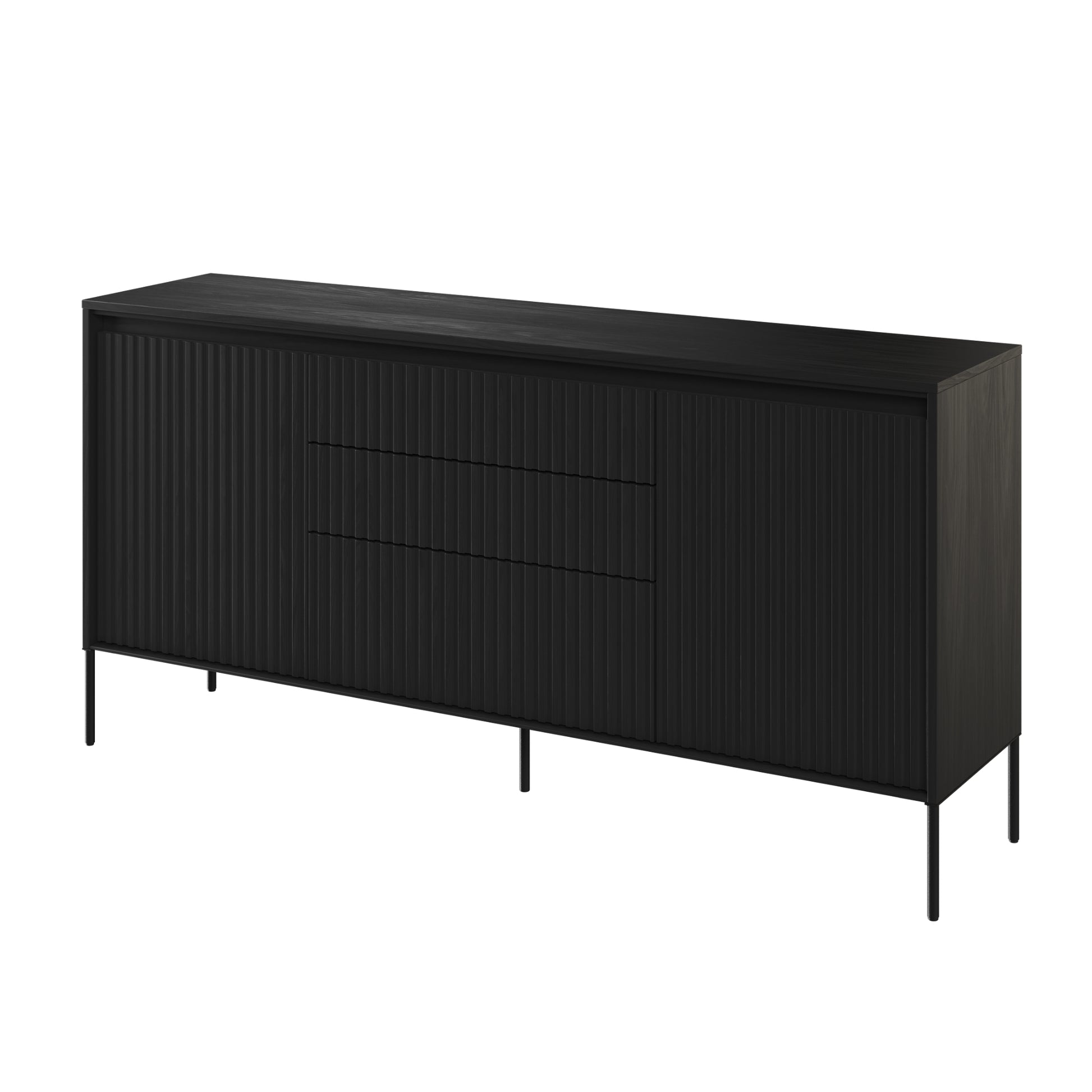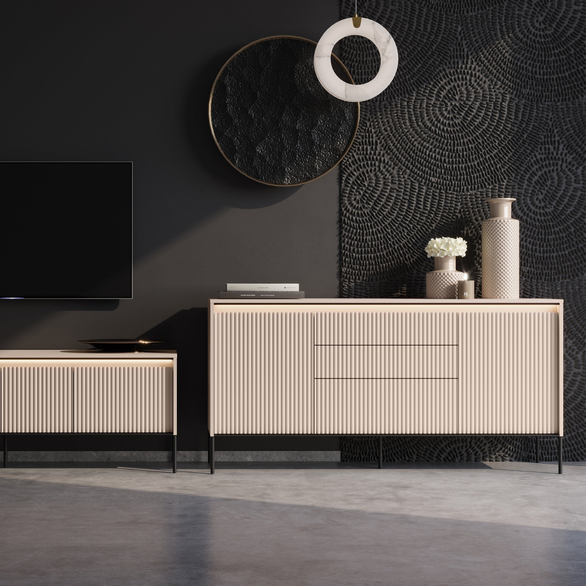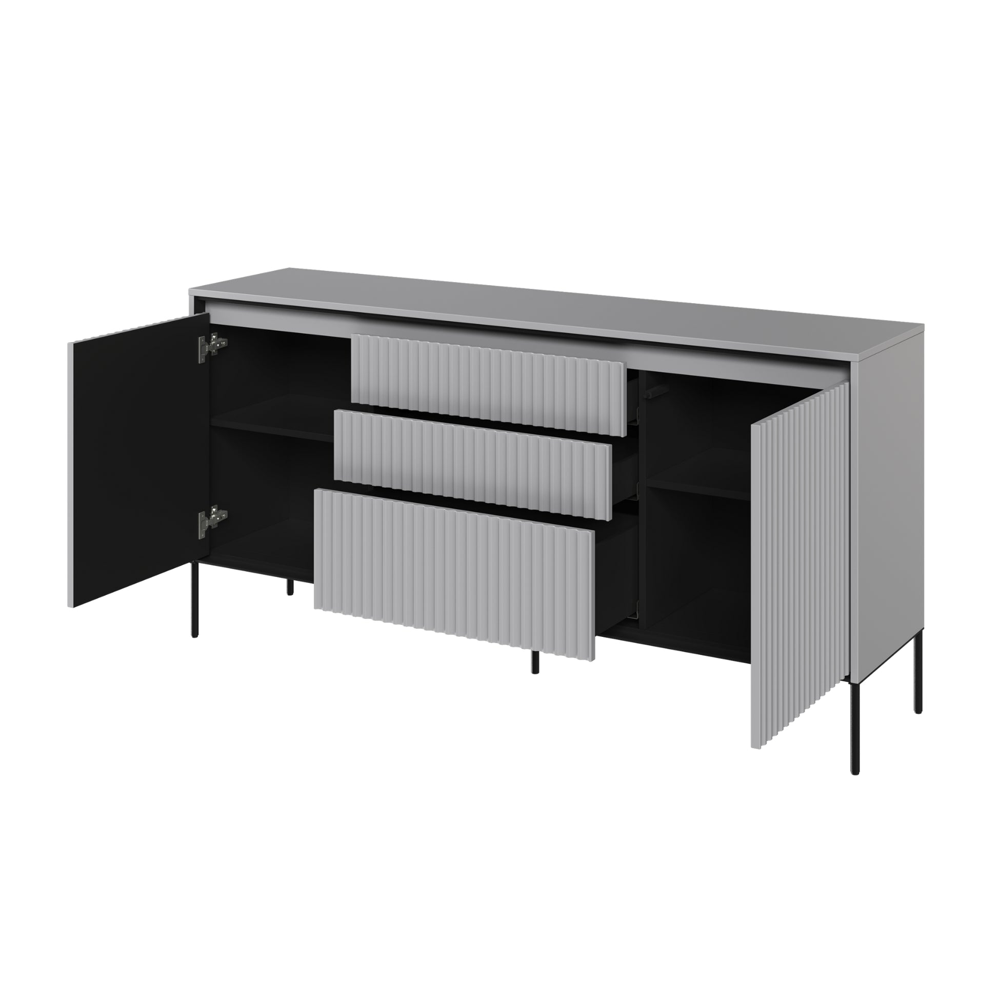 The Trend Sideboard is the perfect combination of unique design and functionality. The elegant fluting on the fronts, highlighted by LED lighting, adds a distinct character to the whole look. Made of high-quality materials, this sideboard is durable and long-lasting. The drawers and enclosed side compartments provide ample storage space, while the wide top can be used to display ornaments or other decorations, making it a practical solution that adds style to any interior. In addition, the push-to-open mechanism installed in the doors and drawers makes it a pleasure to use.