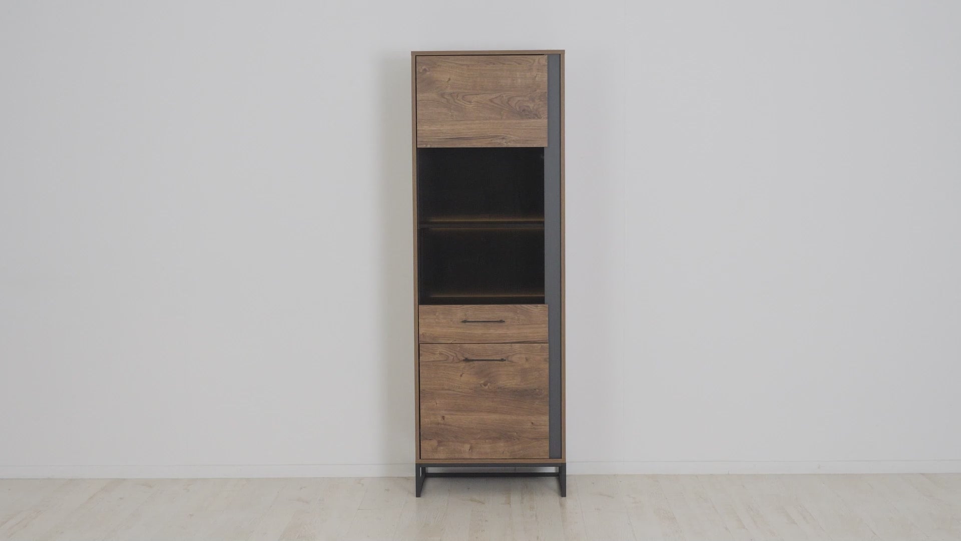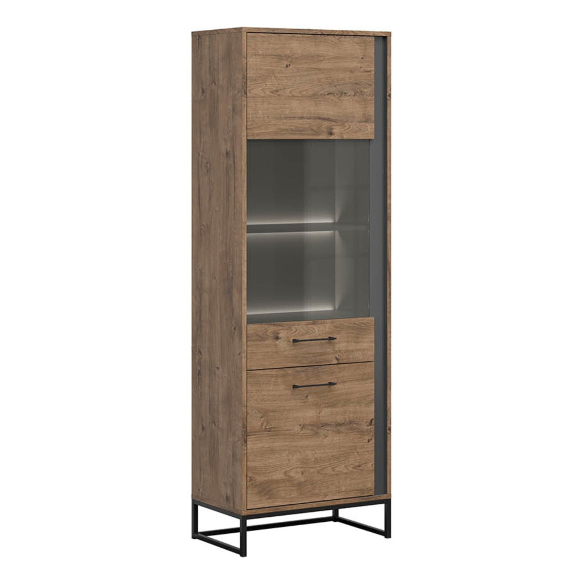 Display cabinet Luton will keep things simple and displayed. This versatile piece features two compartments, the upper one with a tinted glass-fronted door and LED lighting to create a contemporary and warm ambience. The bottom has a solid door to conceal and store, so everything has its dedicated spot. This cabinet is available in two options to consider when deciding - left and right opening. Make sure you choose the correct one to match your setup.