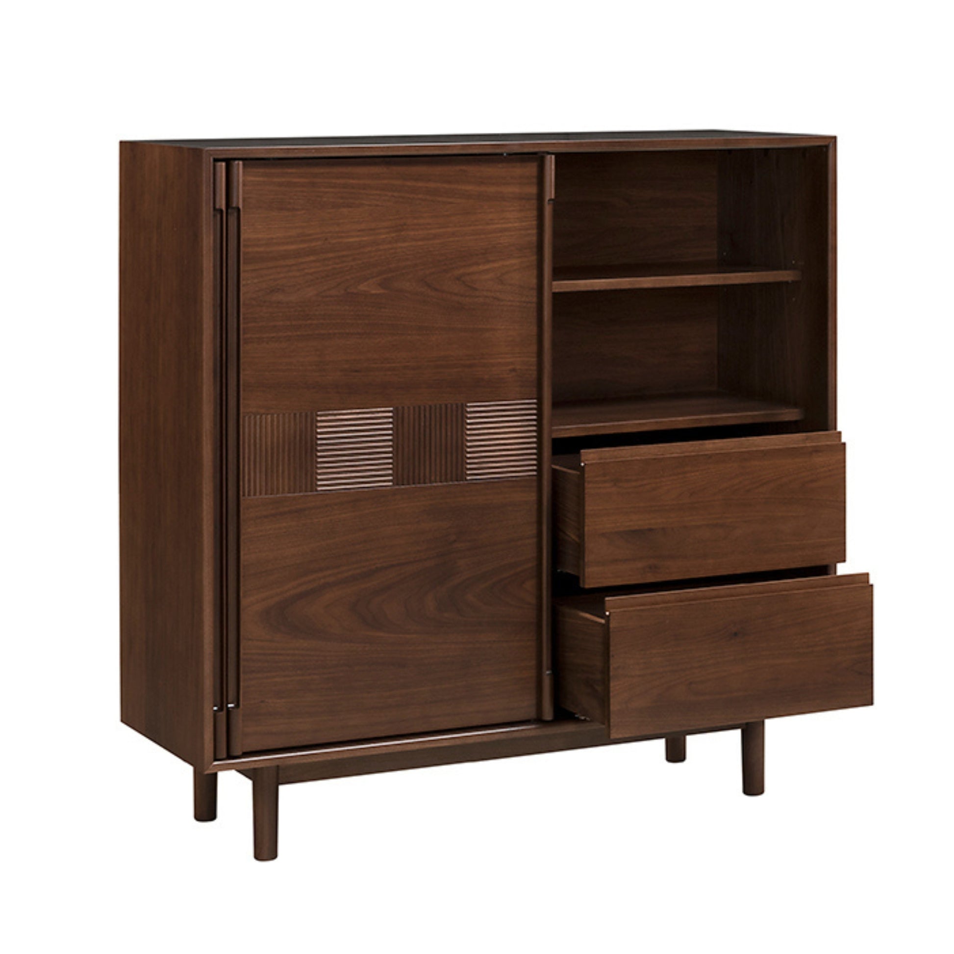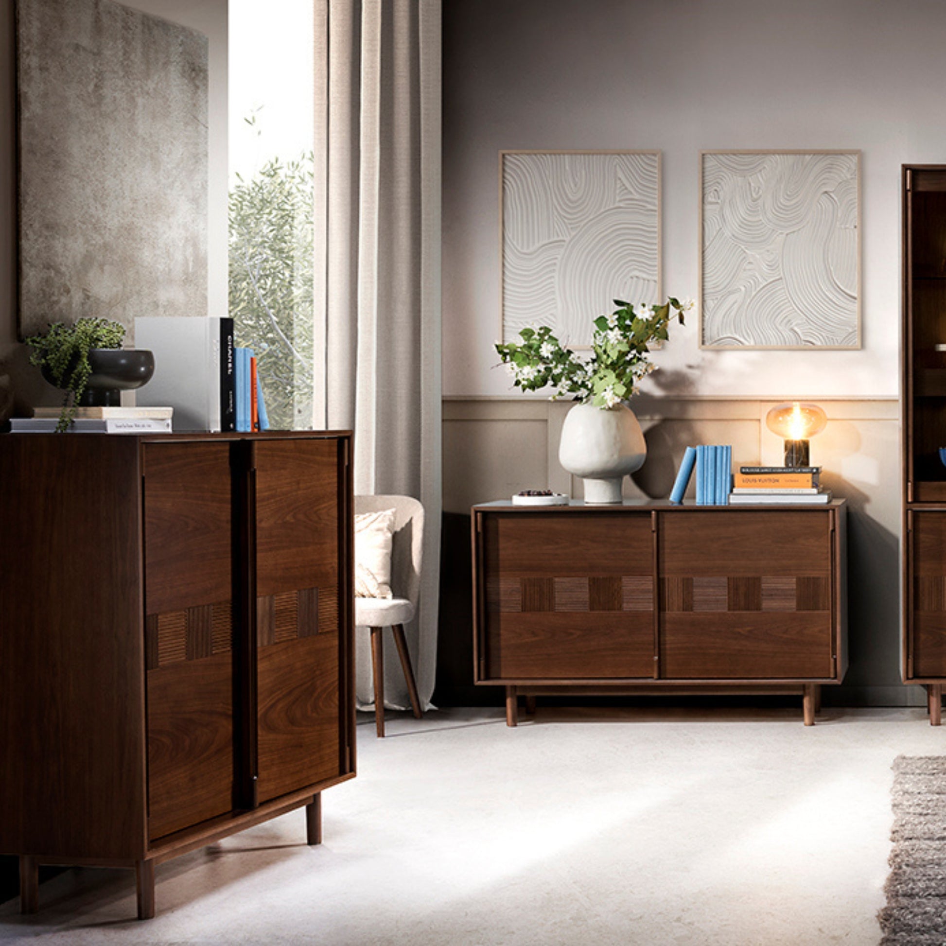 The storage cabinet from the Cantiero collection is made from high-quality walnut veneer and solid wood, it offers both beauty and durability. It features two sliding, self-closing doors, three spacious shelves, and two drawers for smooth, convenient storage. This elegant piece adds both functionality and style to any space.