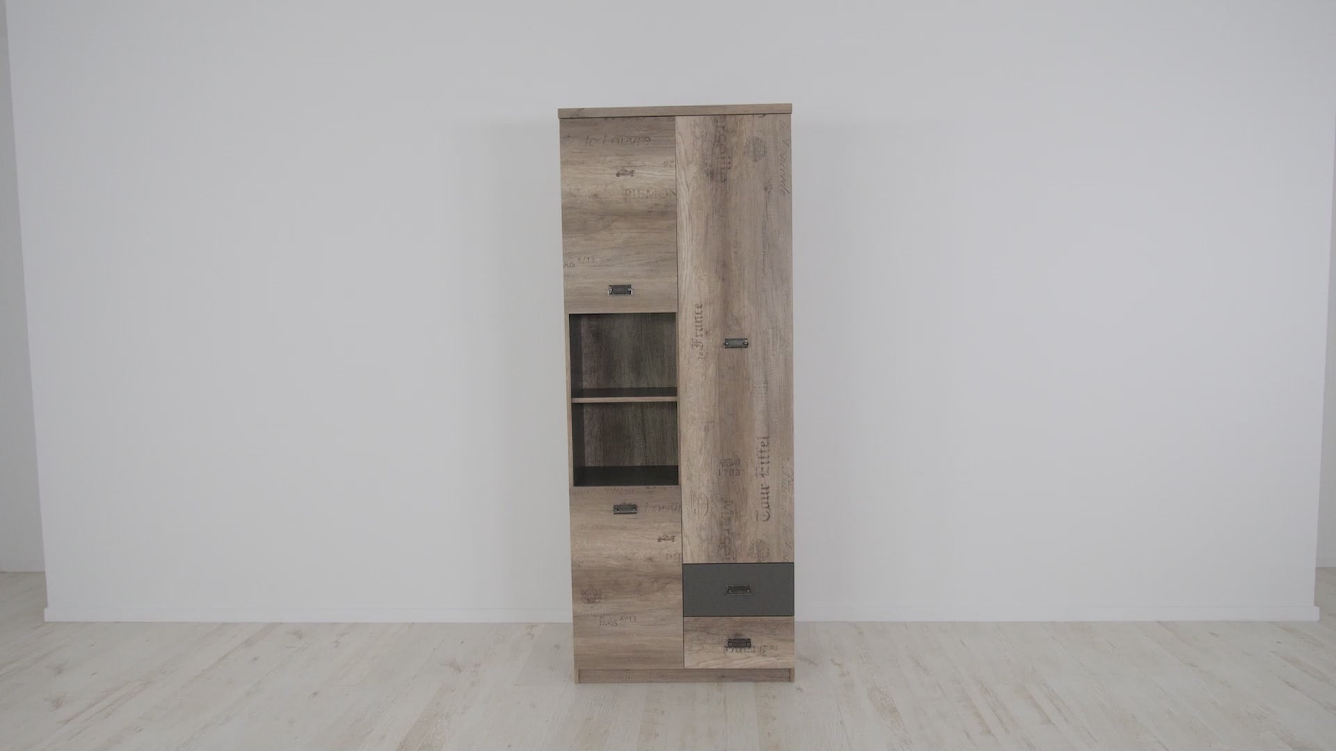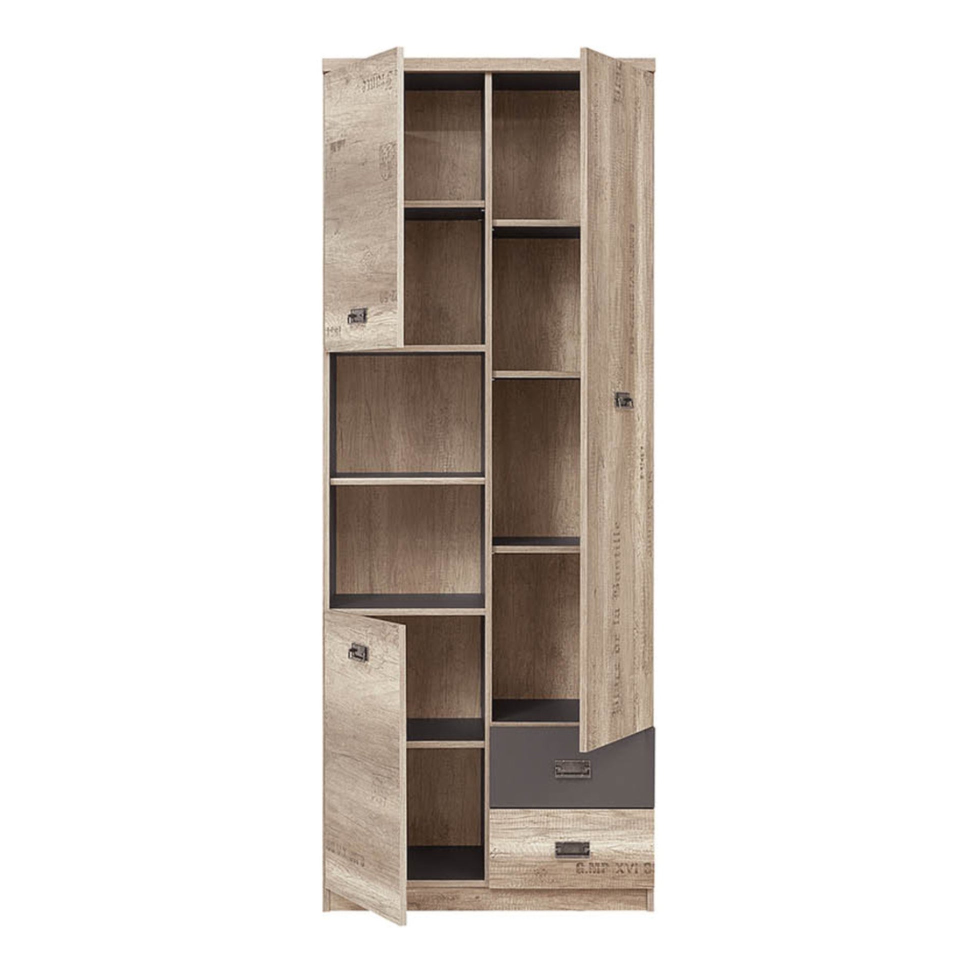 The tall storage cabinet Malcolm is a great solution to organize any space fuss-free, especially in the home office or youth room. Three enclosed compartments, two drawers and open shelves give more than enough space to keep everything organized.