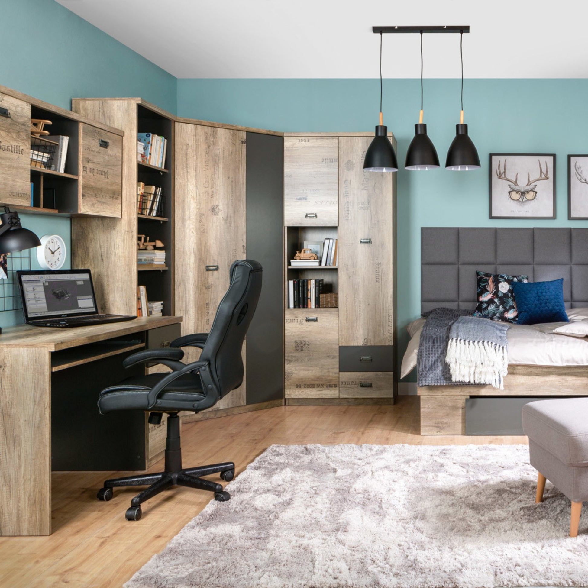 The Malcolm collection is a smart variation of youth furniture. It combines a modern approach to design and traditional colours. All pieces are made in a soft hue of canyon monument oak blended with a gray wolfram accent. The collection's youthful character is outlined by letter prints and large handles in antique nickel colour. Malcolm pieces can be combined in any way to perfectly match the room's requirements and the child's individual needs.