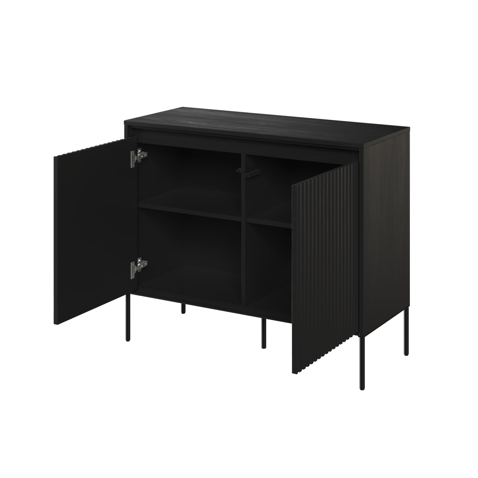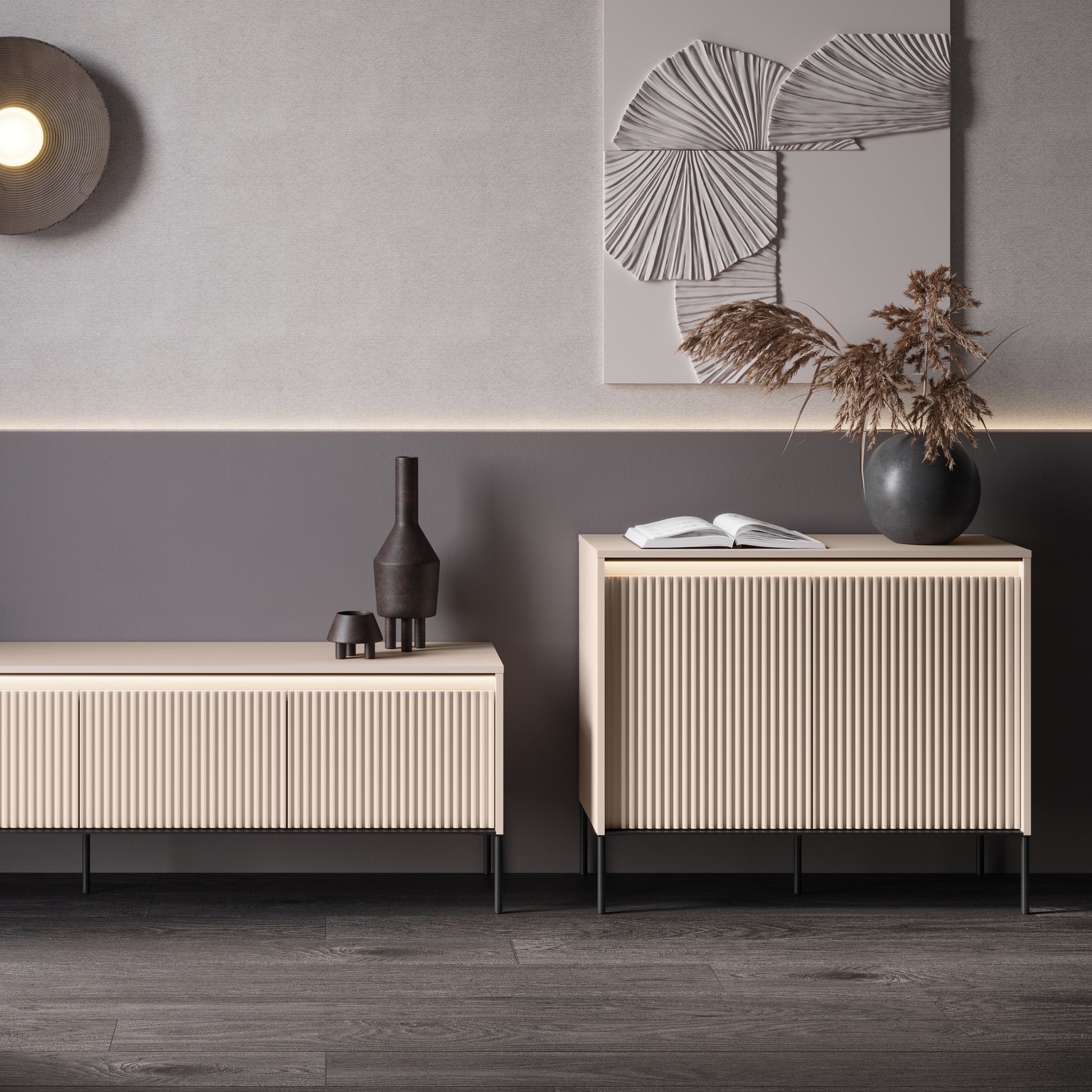 The Trend Storage Cabinet is the perfect combination of unique design and functionality. The elegant slat fluting on the fronts, highlighted by LED lighting, adds a distinct character to the whole look. Made of high-quality materials, this cabinet is durable and long-lasting. The enclosed compartments provide ample storage space, while the wide top can be used to display ornaments or other decorations, making it a practical solution that adds style to any interior. In addition, the push-to-open mechanism installed in the doors makes it a pleasure to use.