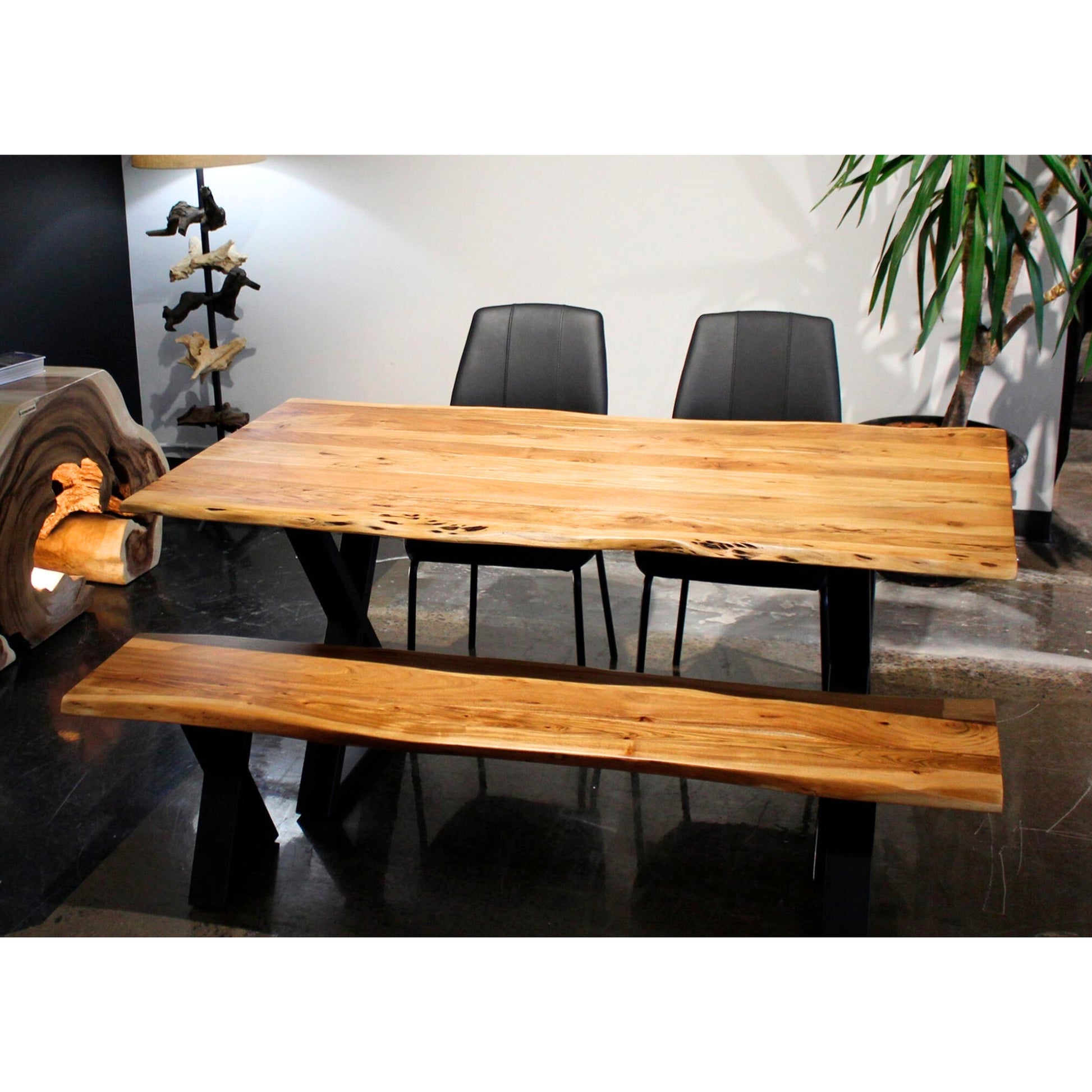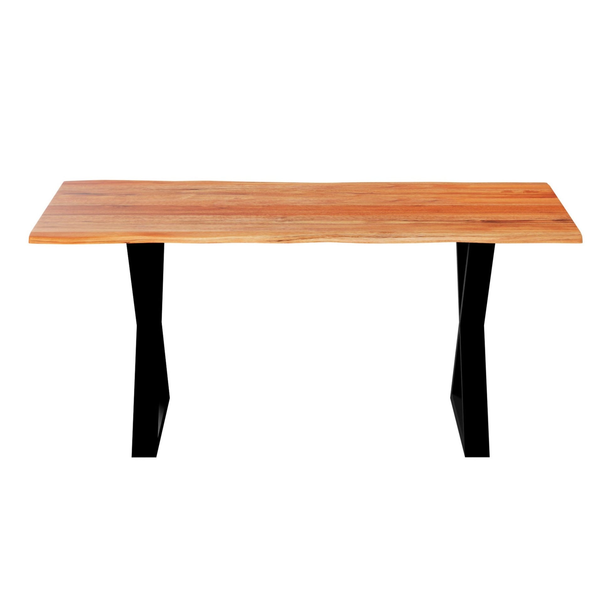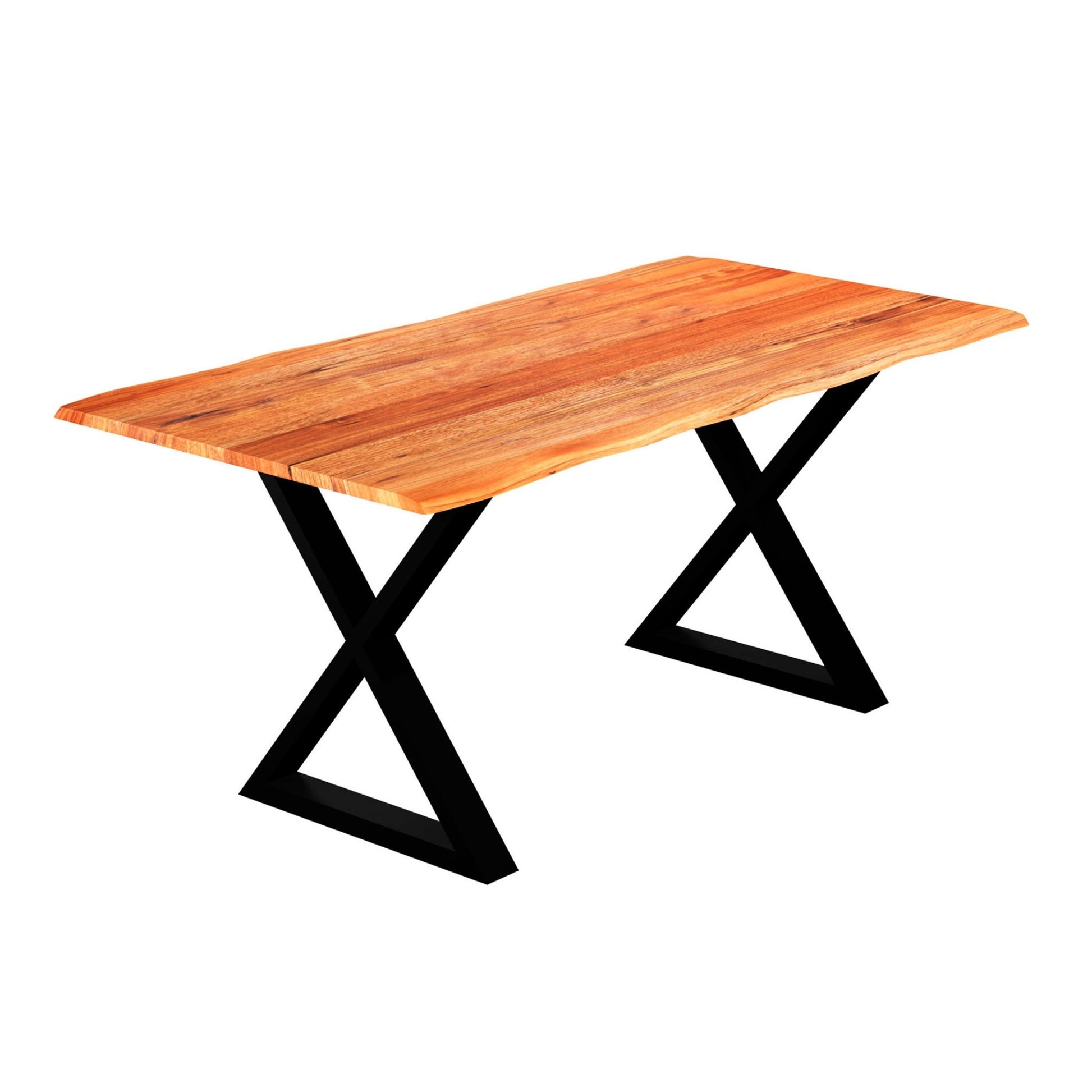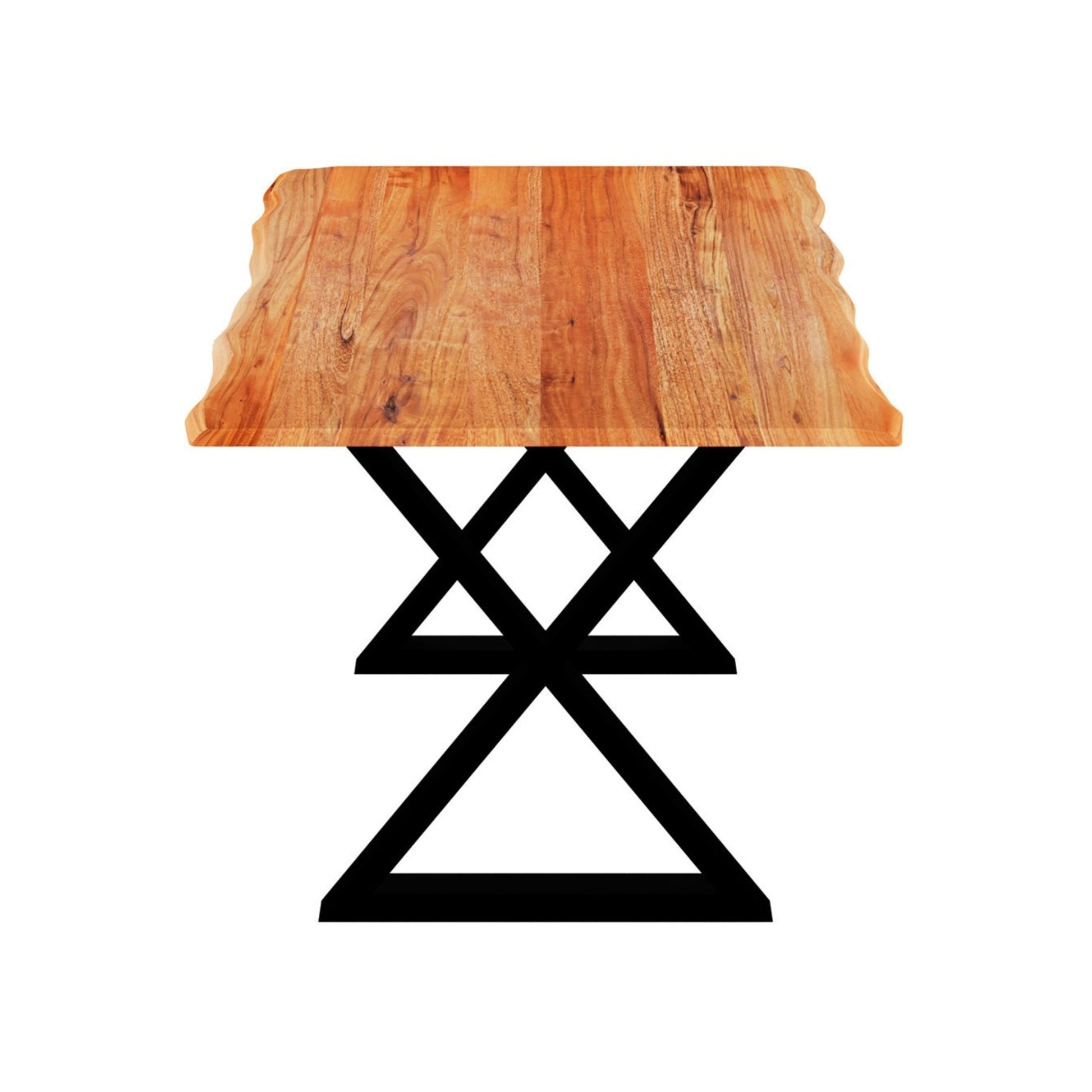 See the true history written on the planks of this table through its knots, grains and fissures. Raw edges emphasize the natural beauty and uniqueness of this table. It is made of solid Acacia planks and finished with a high-quality lacquer. The top perches on a matte black X-shaped base, making it perfect for a modern urban interior. This may be a perfect candidate for those who opt for a cozy ambience and a compact table for a small space.