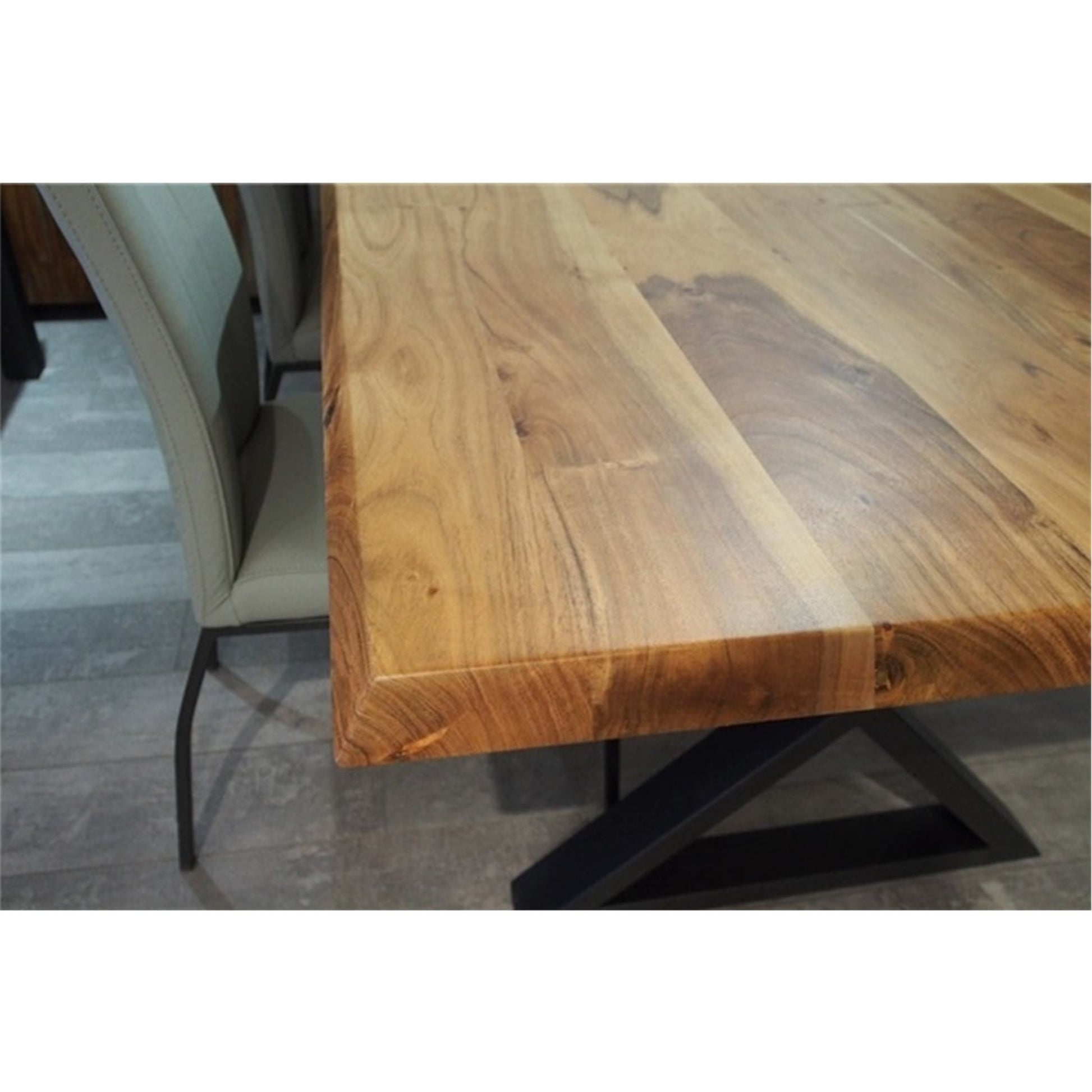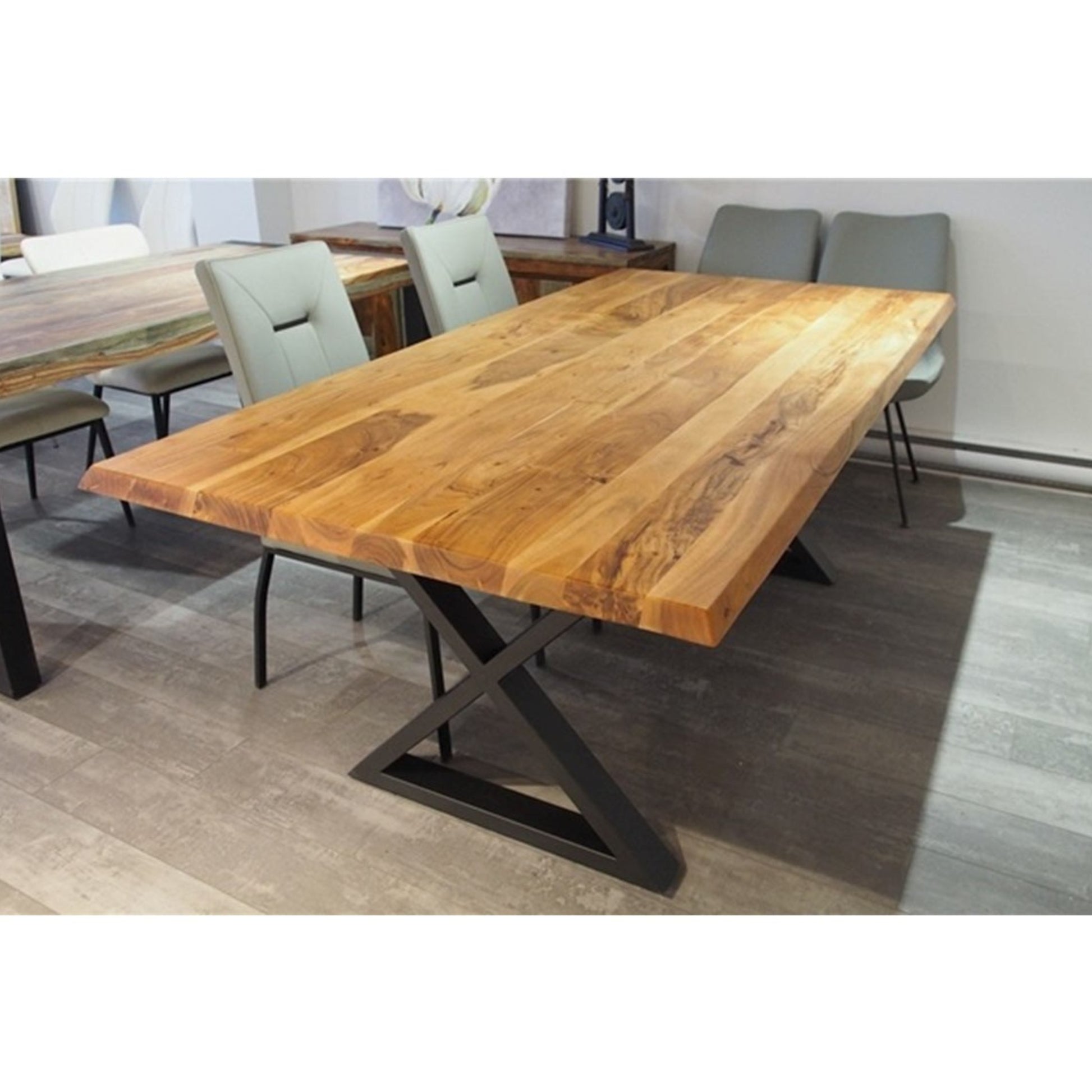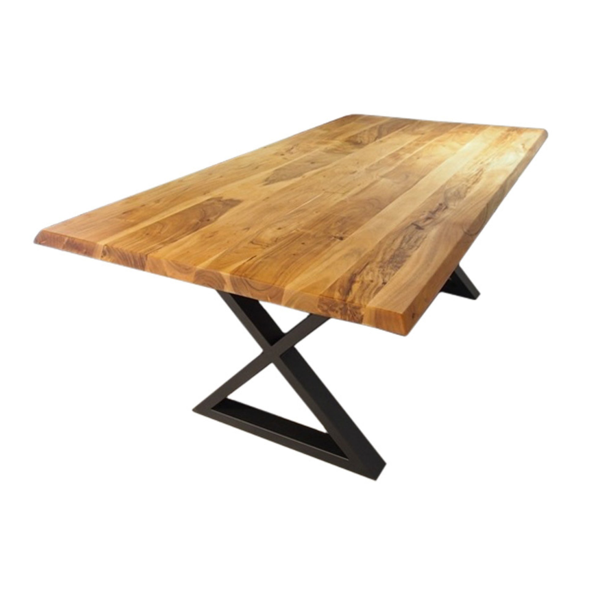 This unique table flirts with a design with a grand style. The top is made of solid Acacia planks finished with high-quality lacquer. Natural warm colour creates a cozy ambience and timeless appearance. The sturdy matte black X-shaped base amps up the whole look and construction of the table. It easily seats six, so you are ready to host a dinner party.