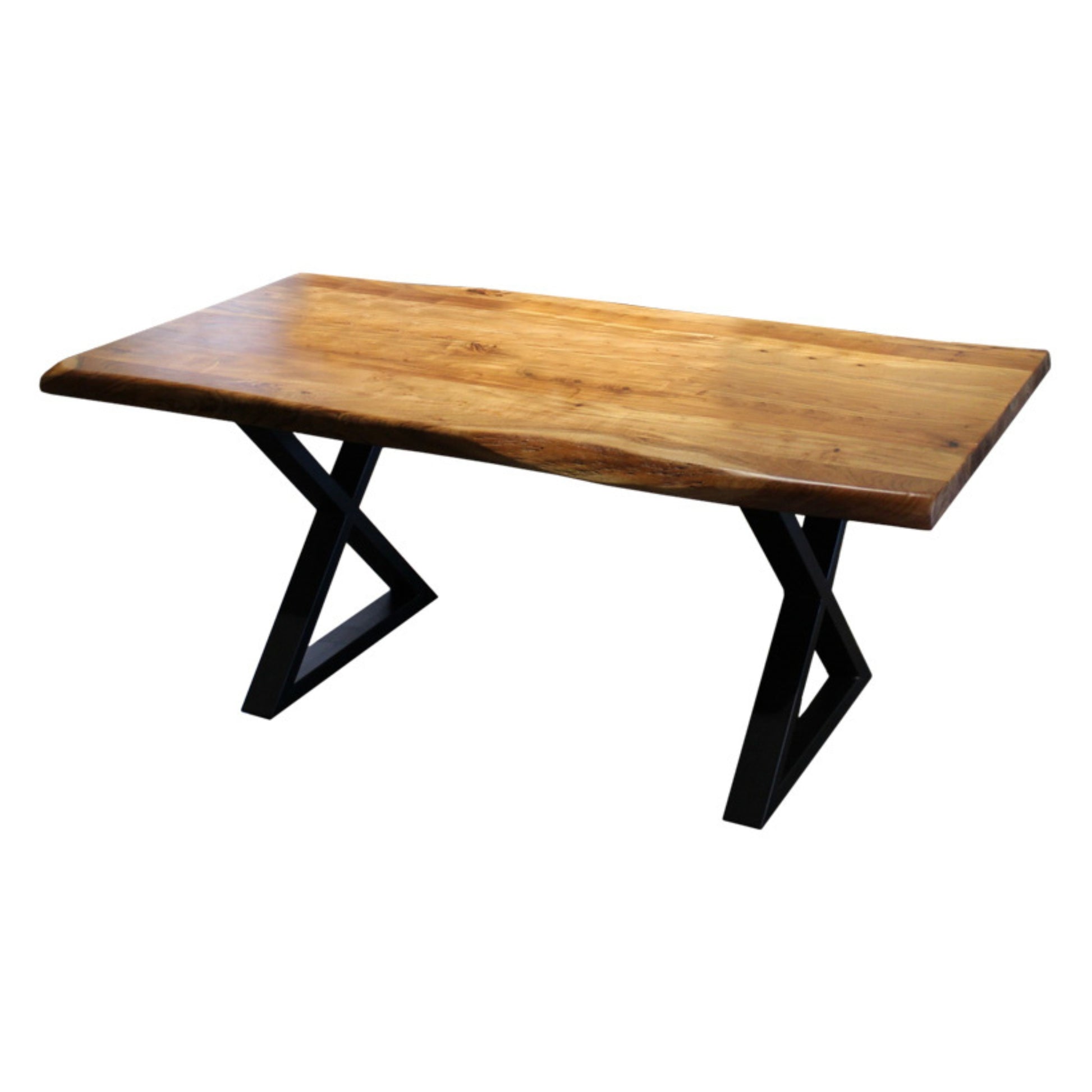 This table was designed to thrill the eye of good-style lovers. The top, made of solid acacia planks, is warm and inviting, while raw edges add a modern flair. The gravity of a thick and heavy top is broken by the black X-shaped base that lends an airy and floating look. This decent-sized table seats six easily, so it will hold family gatherings and wow your guests.