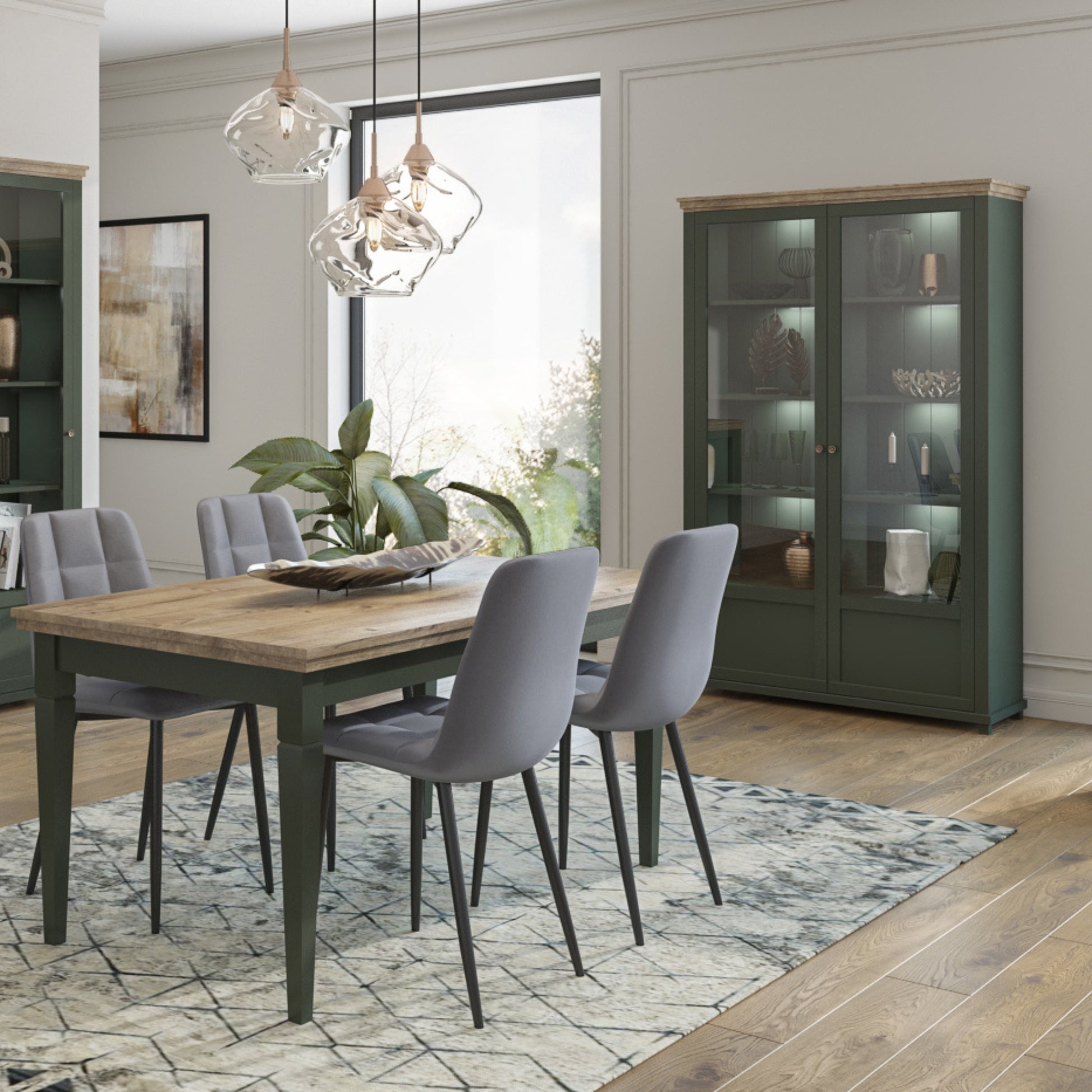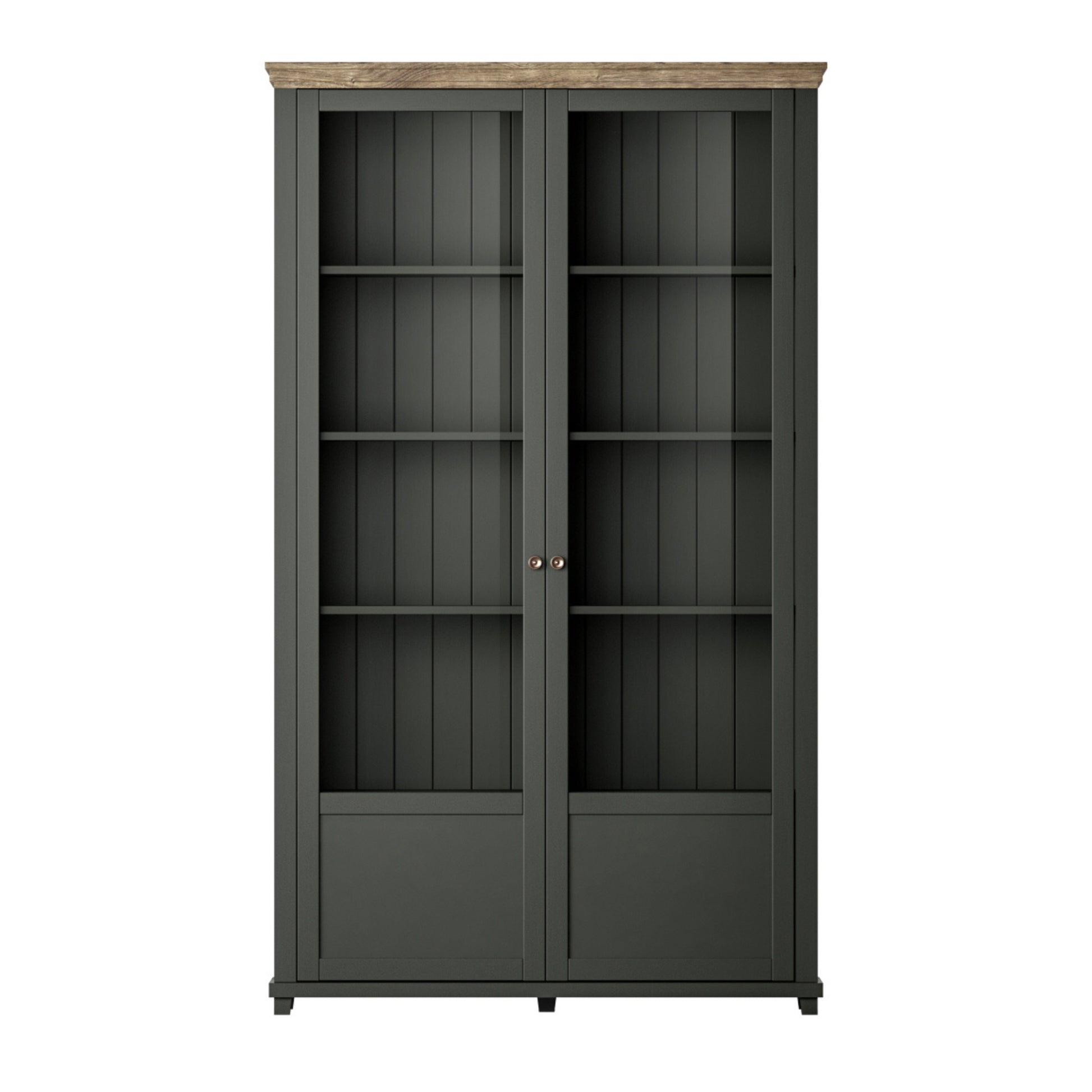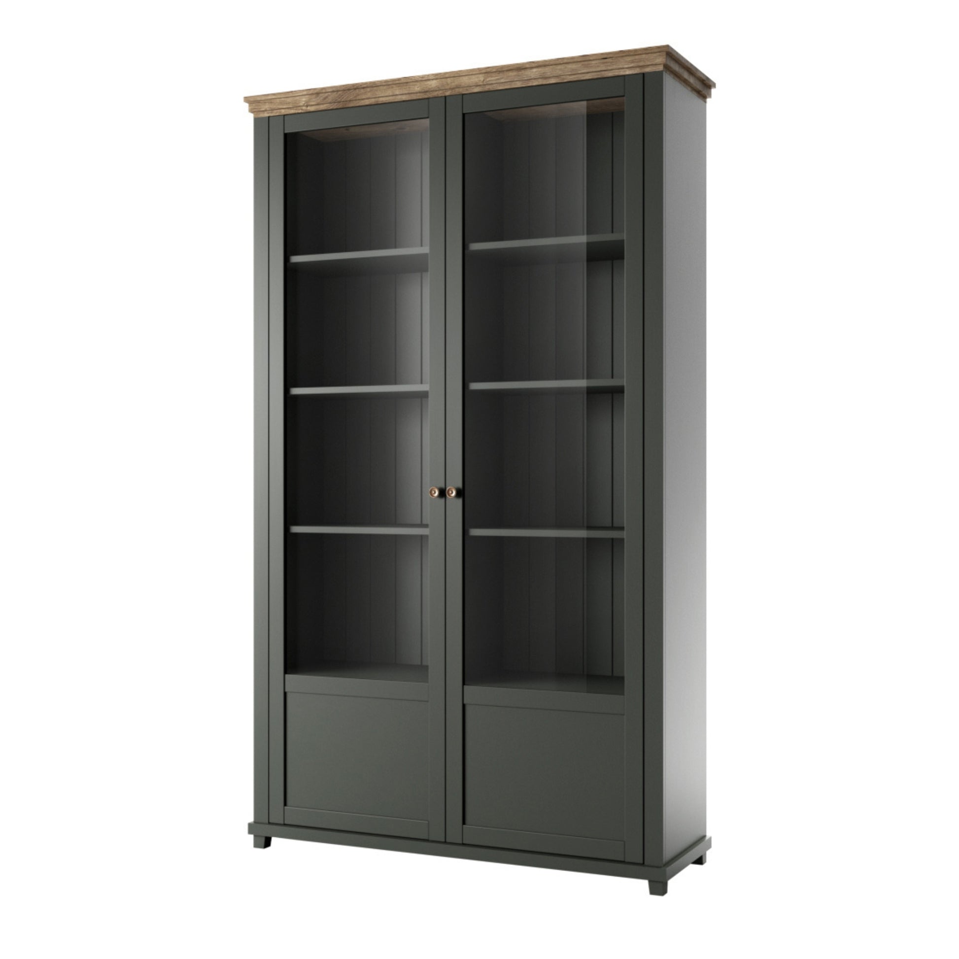 The Evora collection joins classic shapes with calming yet trendy colours of green and oak. To add elegance, all fronts are garnished with antique gold pulls, while the vertical panelling on the back creates an interesting dimension in the display compartments. Whether you live in a contemporary condo or a traditional townhouse, the variety of pieces allows adapting any interior to urban life needs.