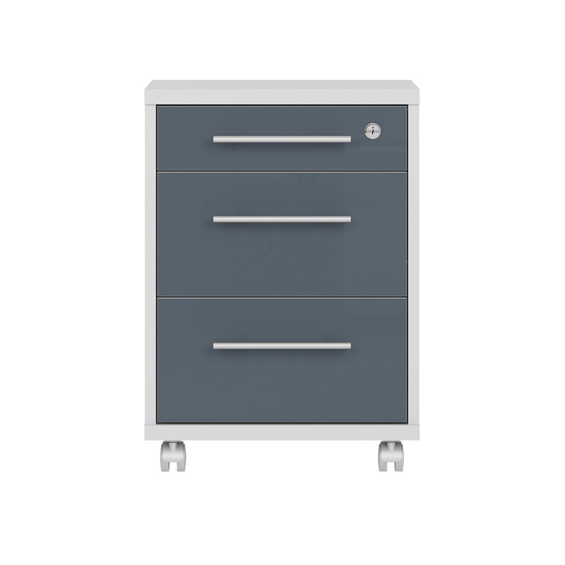 This compact cabinet is a perfect complement for desks lacking storage space. The body is set on four casters, so you can easily pull it from under the tabletop. The low profile of the piece allows us to keep a small printer on it. The cabinet features three drawers, a shallow one for small items and supplies with a lock to keep sensitive files safe and two deep ones for larger documents.