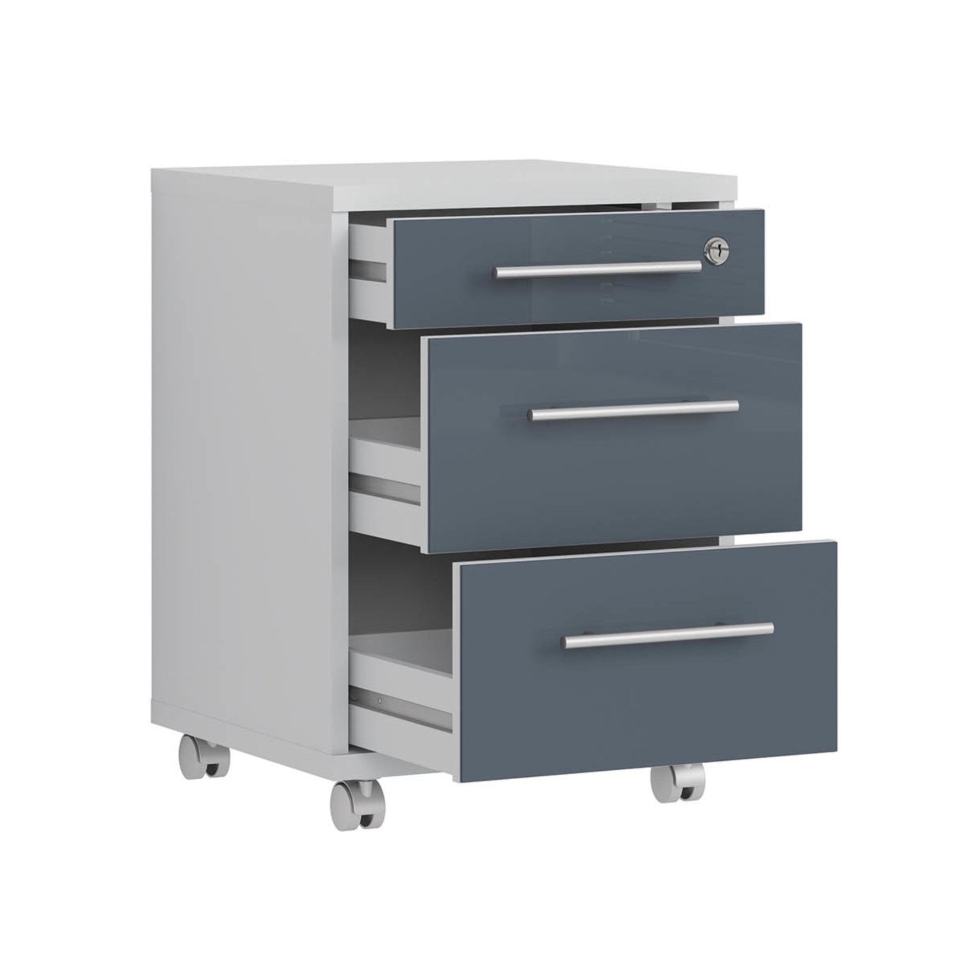 Collection Office Lux is dedicated to modern and contemporary interiors where minimalism and clean aesthetics are required. Grey tones with chrome finishes will work well with any design. Lacquered glass fronts are stylish and reflect the light, so optically enlarge the room. It is worth mentioning that all the cabinets from the Office Lux collection feature lock to keep your documents and essentials safe. A wide range of options allows for creating a versatile setting for any office.